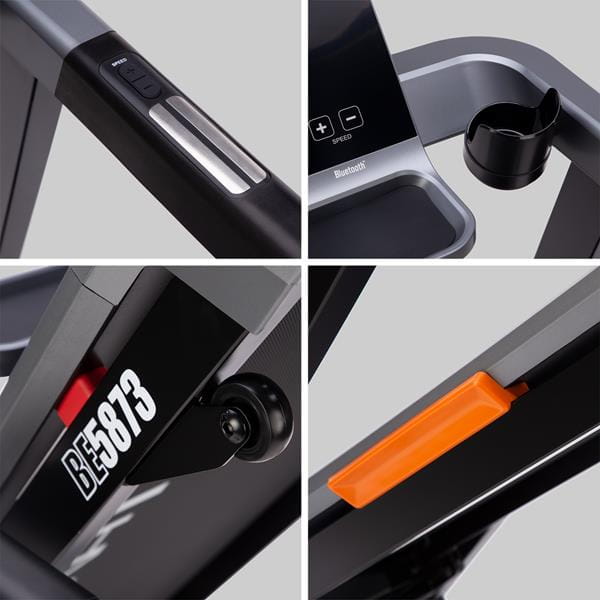 Model BE5873 wyposażony jest w Bluetooth, umożliwiający połączenie z aplikacjami treningowymi takimi jak Kinomap, Zwift i AnyRun. Dodatkowo bieżnia posiada głośnik, co umożliwia słuchanie ulubionej muzyki i korzystanie z aplikacji treningowych w trakcie ćwiczeń.