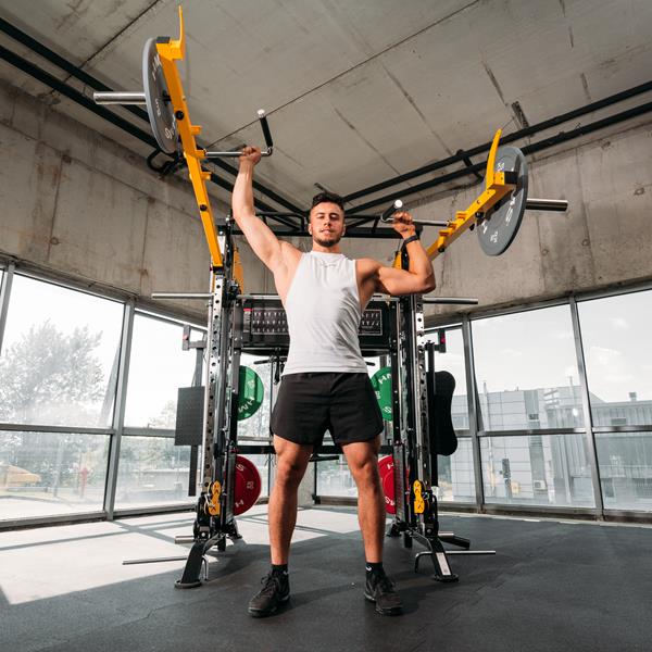 Suwnicę Smitha – z wbudowanym gryfem, pozwalającą na wykonywanie ćwiczeń izolowanych z większym ciężarem. Dzięki systemowi bezpieczeństwa możesz ćwiczyć aż do upadku mięśniowego