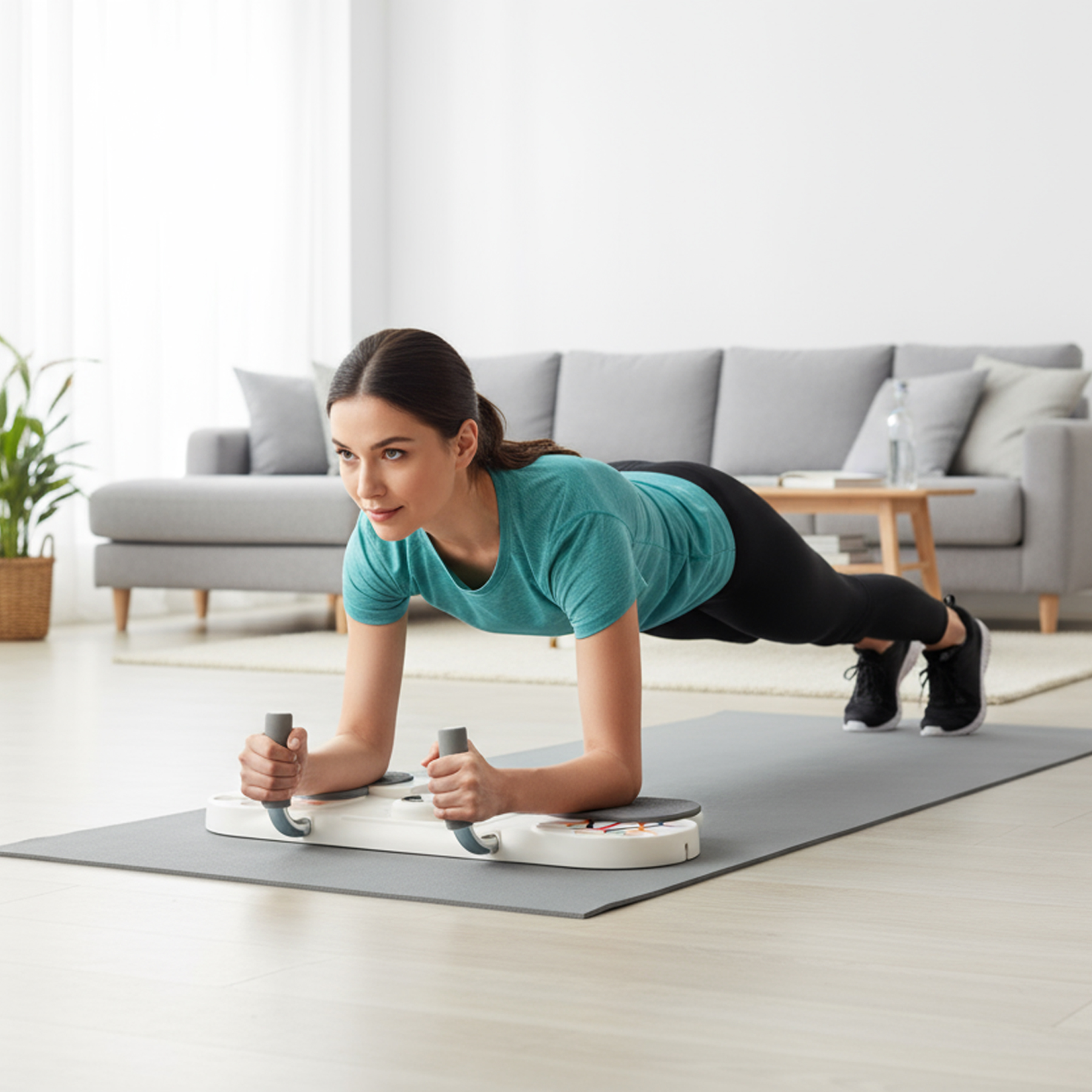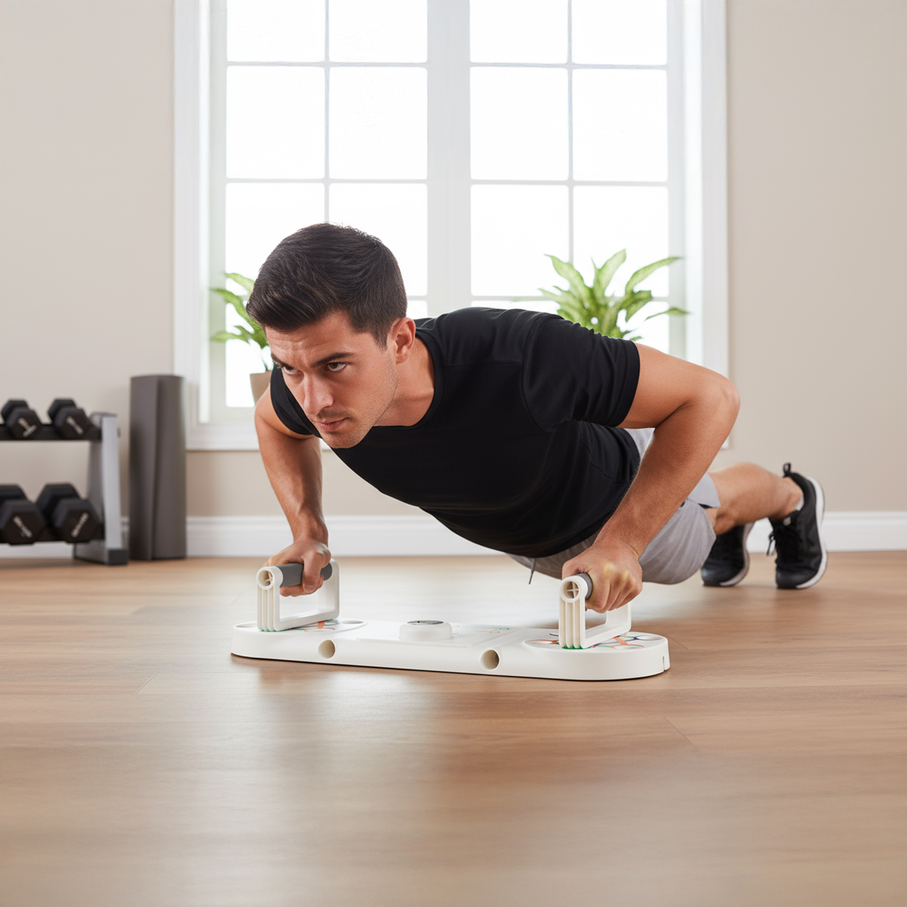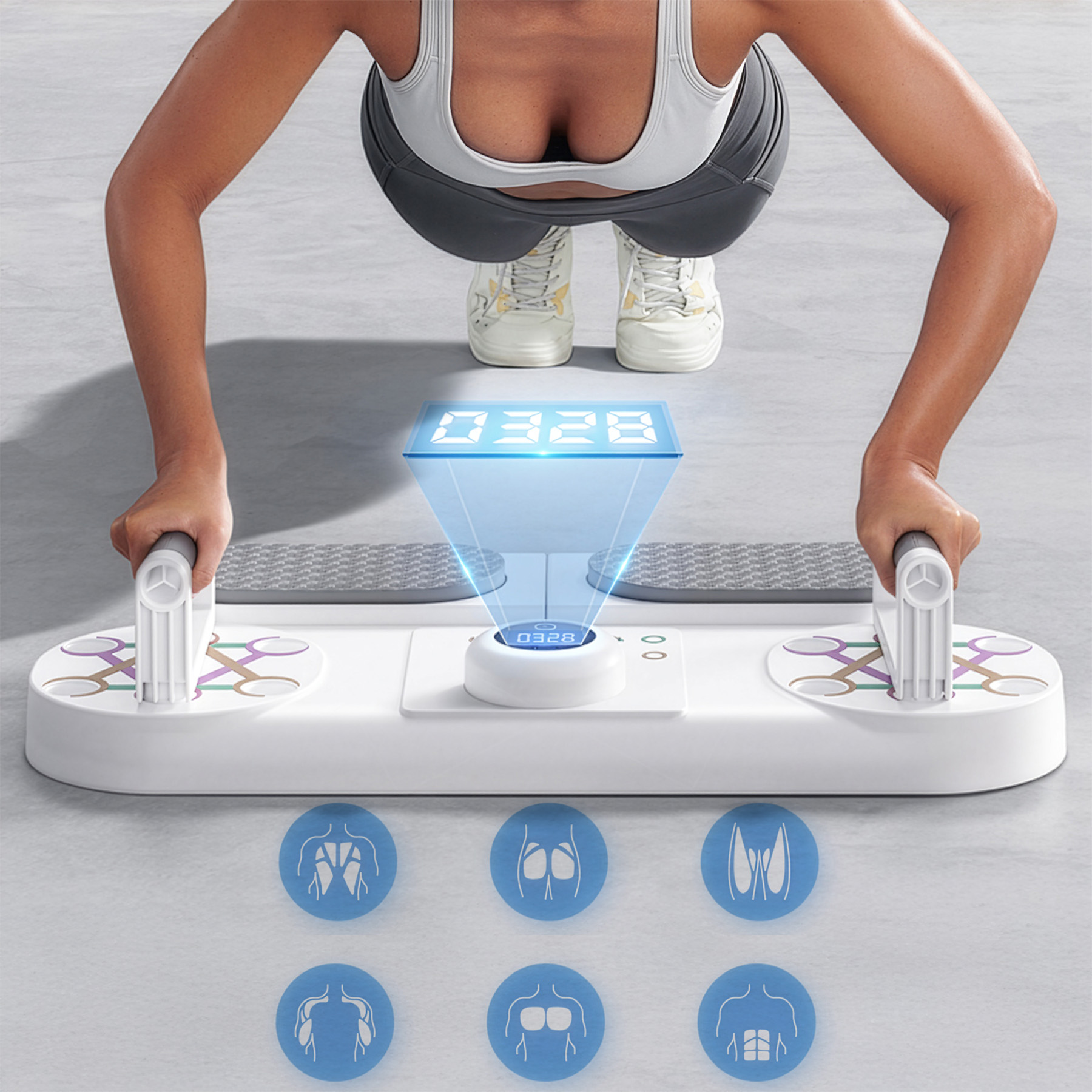 Jeden, kompaktowy przyrząd do skutecznego treningu w domu. DBP03 łączy stabilną deskę do planku, uchwyty do pompek z wieloma ustawieniami oraz inteligentny licznik z optycznym (IR) czujnikiem zbliżeniowym, który automatycznie zlicza powtórzenia.
