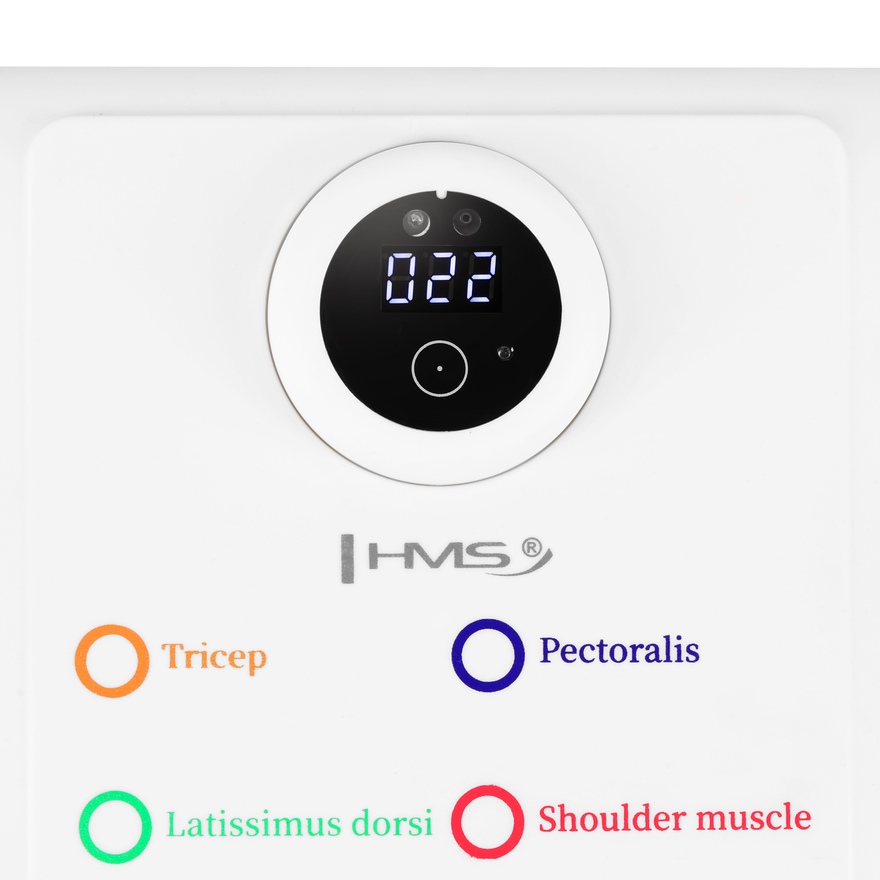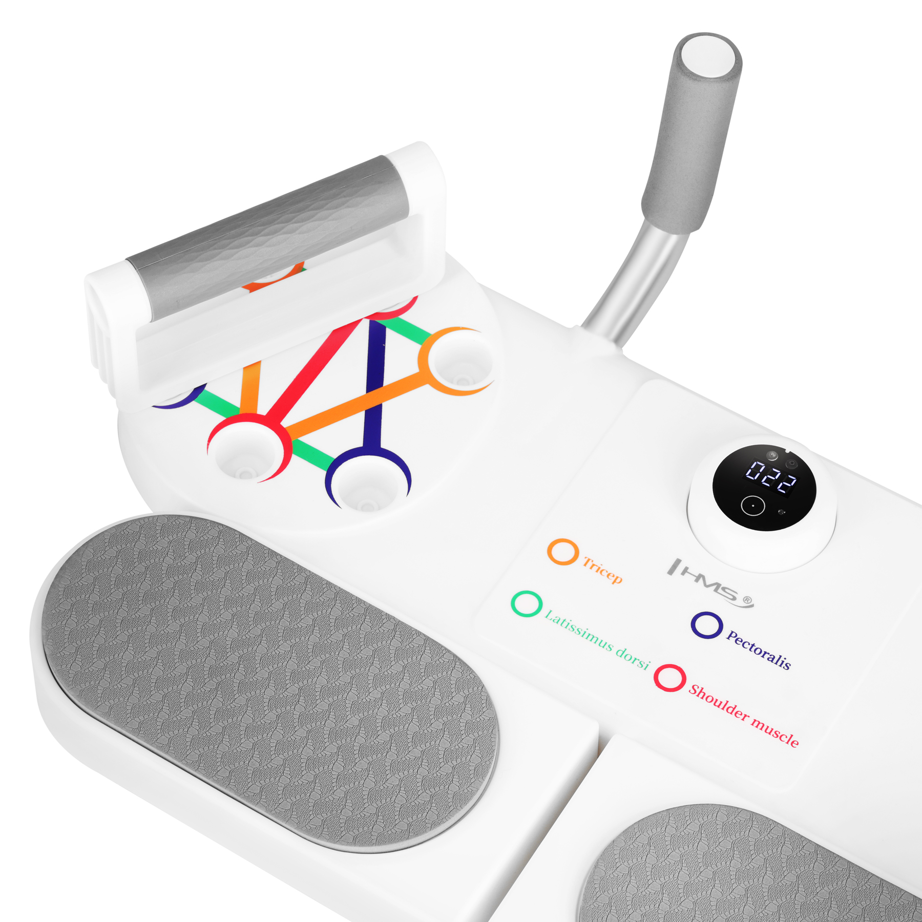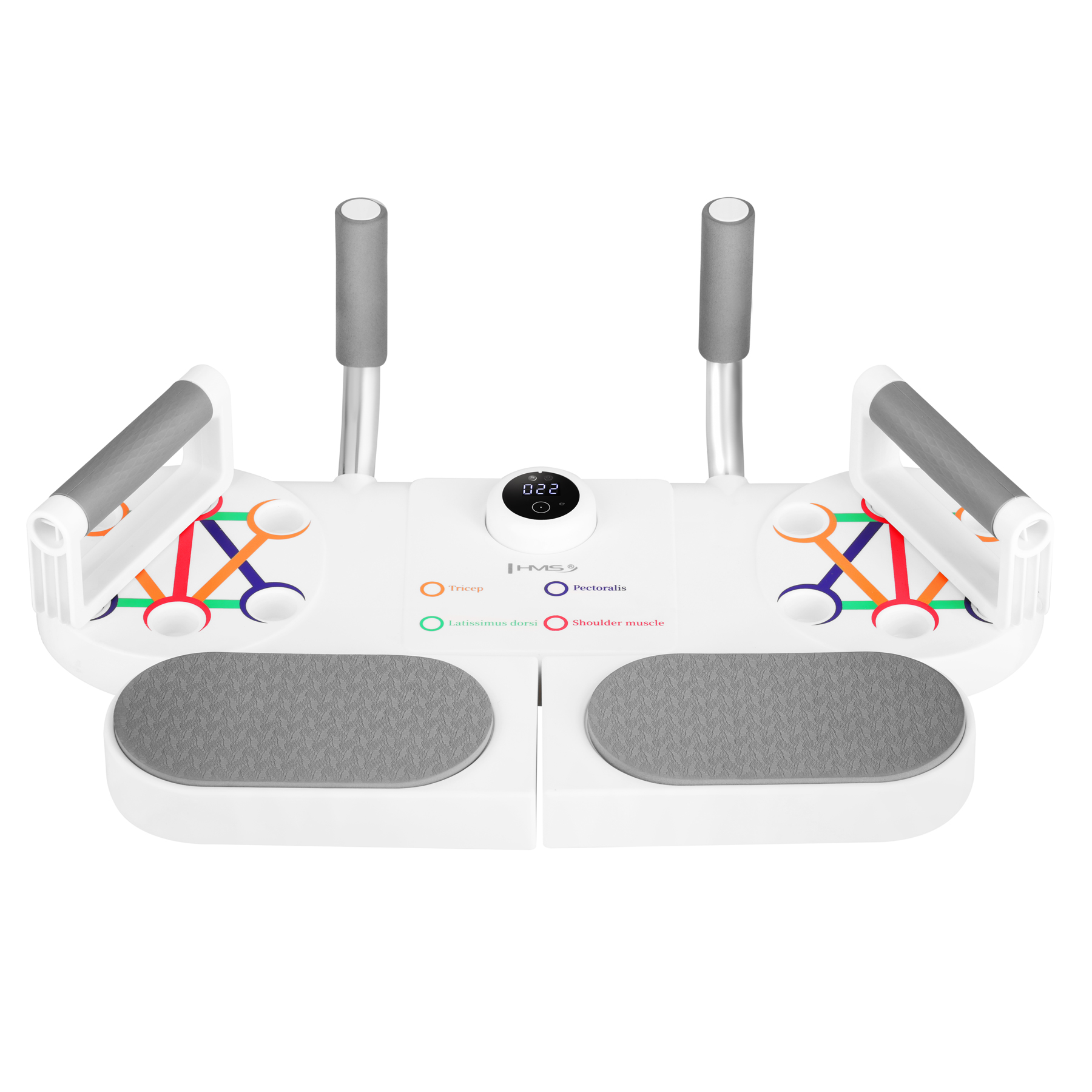 - Smart licznik powtórzeń – optyczny (IR) czujnik zbliżeniowy wykrywa każde zejście w dół i automatycznie liczy powtórzenia; wyświetlacz pokazuje wynik serii.
