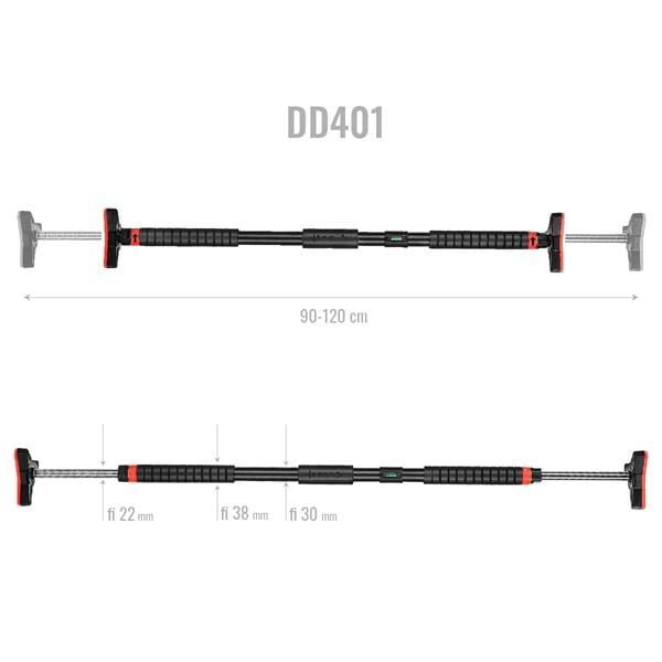 DD401 jest regulowany w zakresie 98-130 cm. dzięki czemu można go dopasować do różnych rodzajów drzwi. Montaż jest bardzo prosty i nie wymaga specjalistycznych narzędzi, Drążek posiada wbudowany klucz nasadowy, drążek jest również łatwy do przechowywania i transportu, co czyni go idealnym wyborem dla osób, które chcą ćwiczyć w domu lub w podróży.