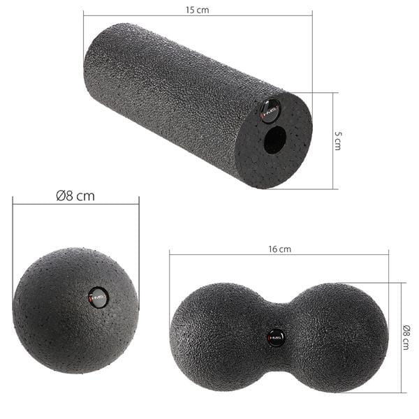 FSBM07 to zestaw małych przyrządów do masażu powięziowego, w skład którego wchodzą: Piłka BLM01 8cm, Piłka Podwójna BLM02 8cm oraz mini wałek FS116.