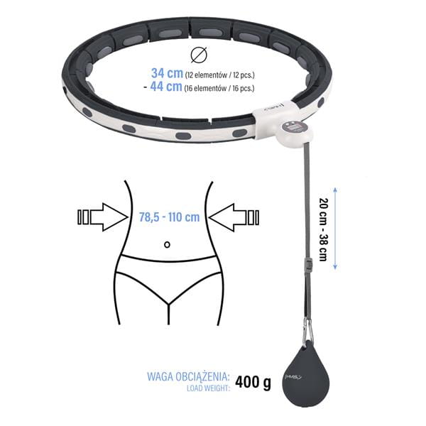 W szybki i wygodny sposób zmniejsz lub zwiększ rozmiar koła, wystarczy wypiąć lub wpiąć tyle elementów, ile potrzebujesz. HHM15 posiada łącznie 16 elementów. Rozmiar można ustawić w zakresie od 12 do 16 elementów, czyli obwód w talii od 78,5 cm do 110 cm (średnica pętli: 34 cm do 44 cm). Dzięki temu urządzenie nigdy nie spadnie podczas treningu, dlatego nawet początkujący mogą z niego korzystać.