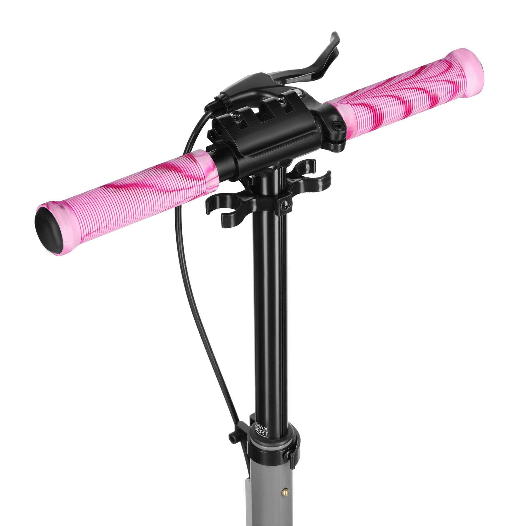Miękkie, gumowe rączki poprawiają komfort chwytu, a łożyska ABEC-7 odpowiadają za spokojną, płynną i kontrolowaną jazdę. Składana konstrukcja umożliwia szybkie złożenie hulajnogi, co ułatwia transport i przechowywanie – po złożeniu model przenosi się wygodnie, trzymając za kierownicę.