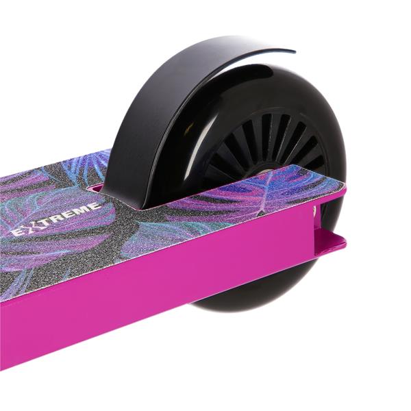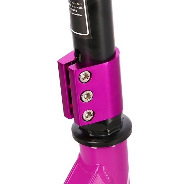 Hulajnoga stunt jest pozbawiona mechanizmu składania konstrukcji czy też systemu regulacji wysokości kierownicy – tego typu rozwiązania mogłyby osłabić całą konstrukcję, co oczywiście nie jest pożądane w przypadku sprzętu wyczynowego, gdzie wytrzymałość to podstawa. W trakcie wykonywania trików sprzęt spotyka się z bardzo dużym obciążeniem. Hulajnoga posiada solidny, trójkomorowy deck co umożliwi satysfakcjonujące wykonywanie trików zarówno początkującym, jak i zaawansowanym stunterom.