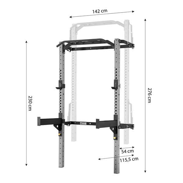 Klatka posiada wielofunkcyjny drążek do podciągania, który dzięki różnym możliwościom chwytu pozwala na rozwijanie mięśni pleców, ramion i klatki piersiowej. Podciąganie to jedno z najlepszych ćwiczeń na górną część ciała, ponieważ angażuje wiele grup mięśniowych i poprawia mobilność stawów. Aby uprościć sobie to ćwiczenie, wystarczy użyć specjalnych gum oporowych. W KLT23 znajdziesz również dwa haki pod gryf, które możesz zamontować na dowolnej wysokości.