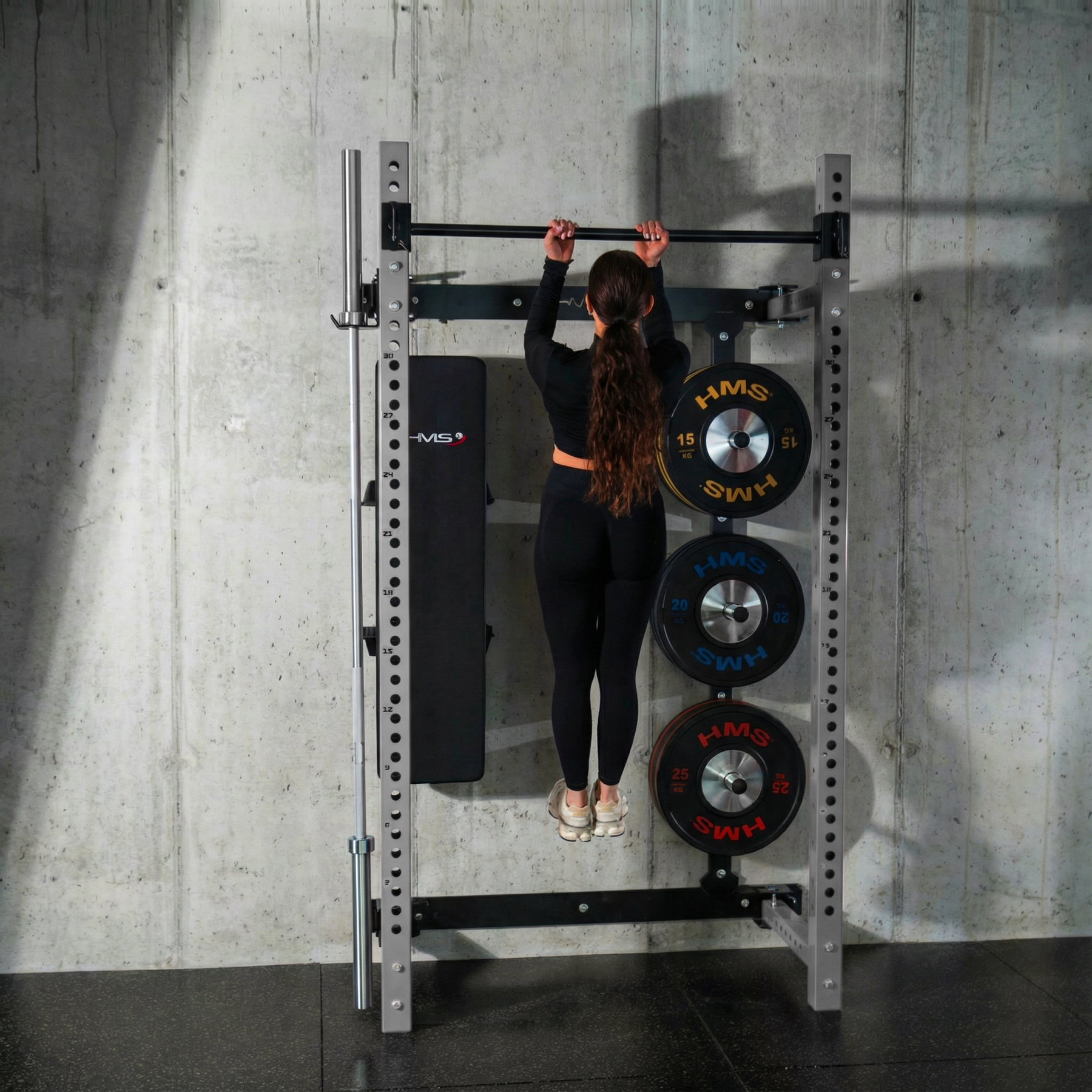 Konstrukcja klatki została uzupełniona o dedykowane miejsce do przechowywania gryfu, co ułatwia organizację sprzętu i pozwala zachować porządek w przestrzeni treningowej. To praktyczne rozwiązanie szczególnie doceniane w domowych siłowniach.