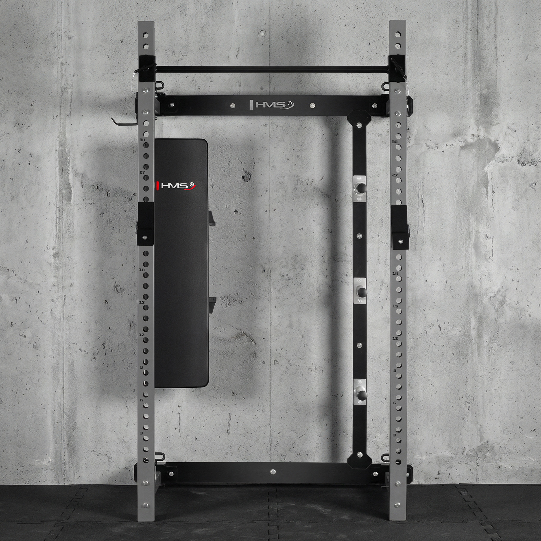 Klatka KLT34 HMS Fitness została wyposażona w składaną ławkę treningową, która umożliwia wykonywanie m.in. wyciskania sztangi, ćwiczeń z hantlami oraz treningu mięśni brzucha. Po zakończeniu treningu ławkę można złożyć, co dodatkowo zwiększa oszczędność miejsca.