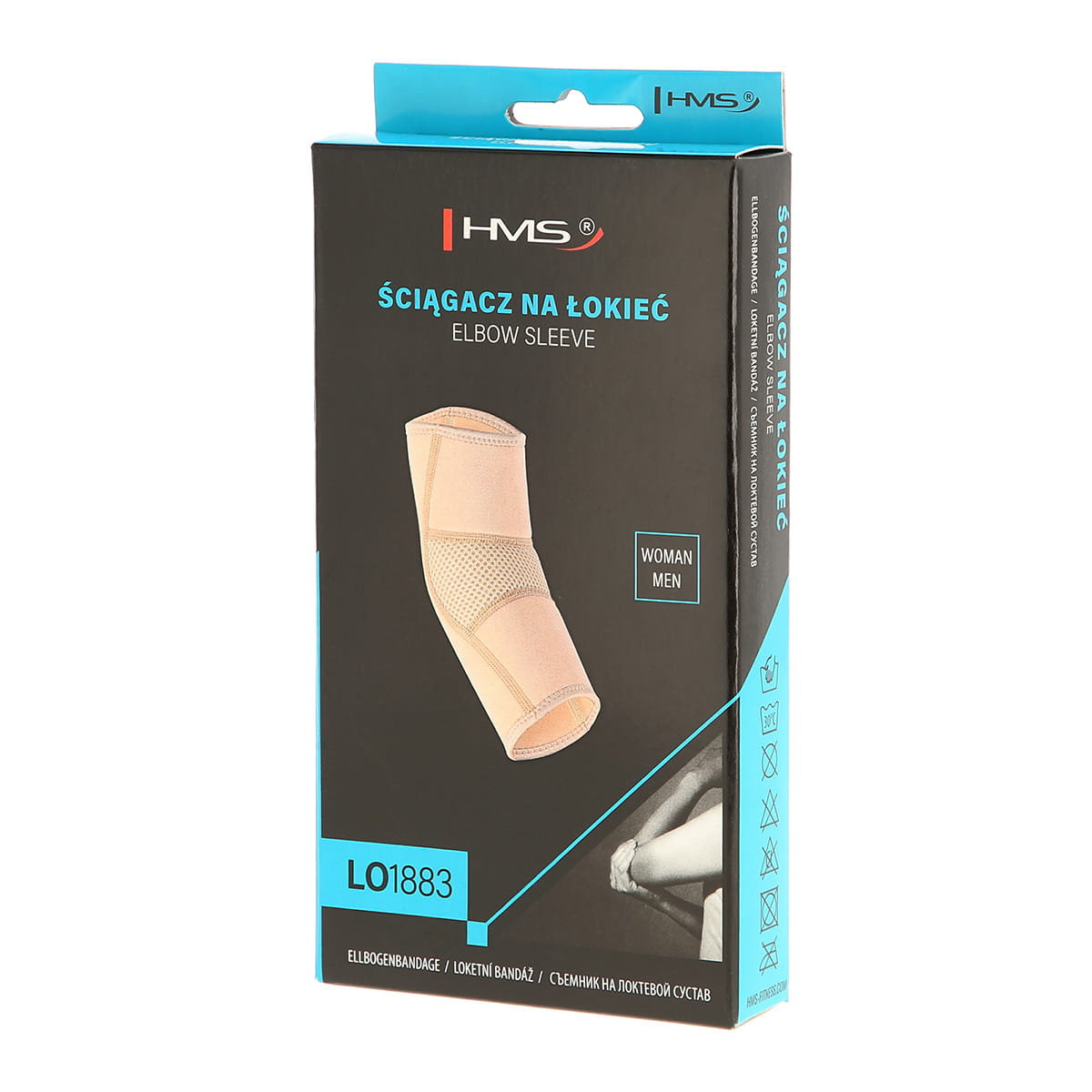 LO1883 HMS - ściągacz na staw łokciowy, to miękka oraz wygodna opaska uciskowa. Produkt zapewnia wsparcie łokcia, nie ograniczając zdolności ruchowych. Ściągacz został wykonany z dwóch materiałów: neoprenu oraz poliestru. Dzięki temu idealnie dopasowuje się do kształtu ciała. Specjalne wycięcie, stabilizuje łokieć. LO1883 HMS sprawdzi się idealnie, w profilaktyce i ochronie przed urazami oraz przeciążeniami stawu łokciowego. Pomaga także, utrzymać naturalne ciepło ciała oraz poprawia krążenie krwi. Skutkuje to, zmniejszeniem się bólu, obrzęków oraz zdrętwień, a ponadto umożliwia szybsze leczenie urazów.