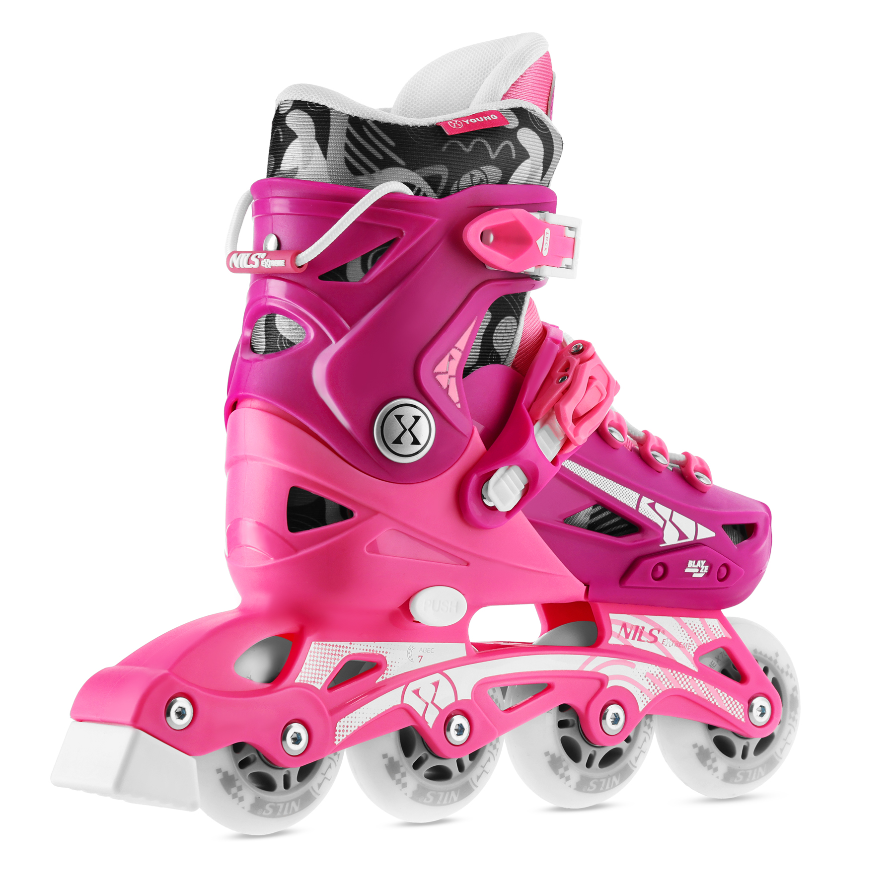 NA1055 BLAZE NILS EXTREME to regulowane łyżworolki dla dzieci i młodzieży, stworzone z myślą o nauce oraz rekreacyjnej jeździe. Model wyróżnia się nowoczesnym, sportowym designem z dynamicznymi detalami i energetyczną kolorystyką, dzięki czemu prezentuje się atrakcyjnie i nowocześnie, a jednocześnie pozostaje uniwersalny na co dzień.