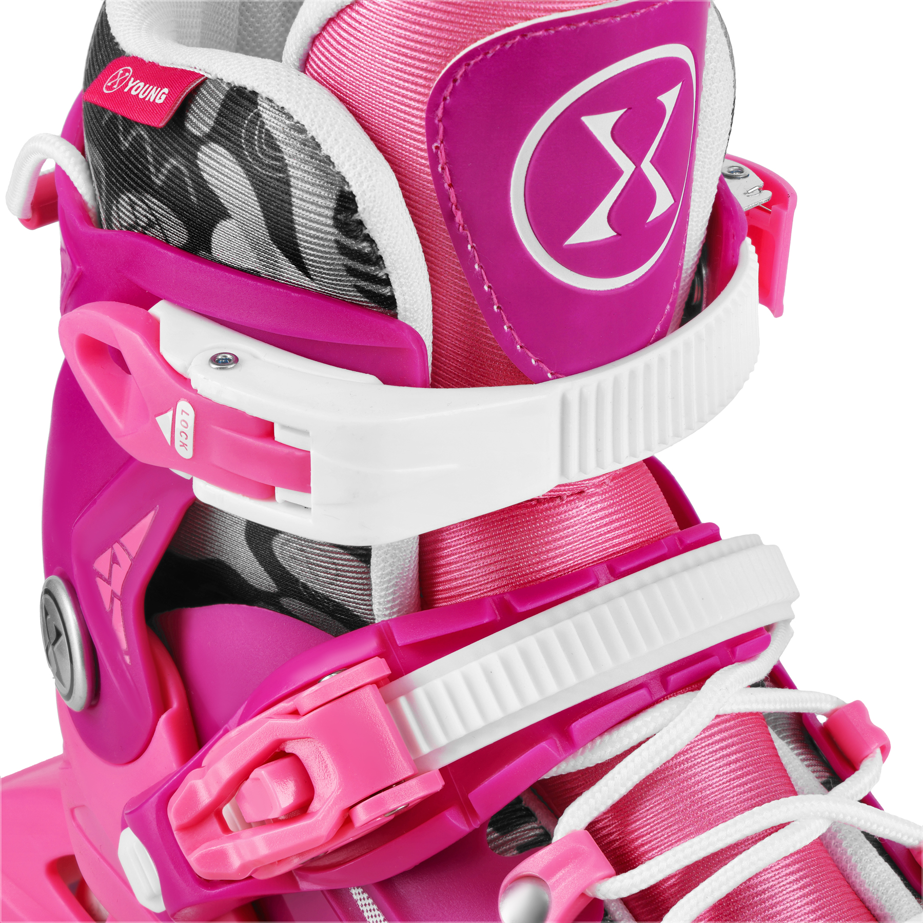 Konstrukcja została zaprojektowana tak, aby ułatwić początkującym utrzymanie stabilności i lepszą kontrolę podczas jazdy. Rolki posiadają regulację rozmiaru — za pomocą przycisku „PUSH” można łatwo dopasować but do rosnącej stopy dziecka. O odpowiednie trzymanie nogi dbają sznurowadła oraz klamra, które pomagają dobrze ustabilizować stopę i zwiększają komfort użytkowania.