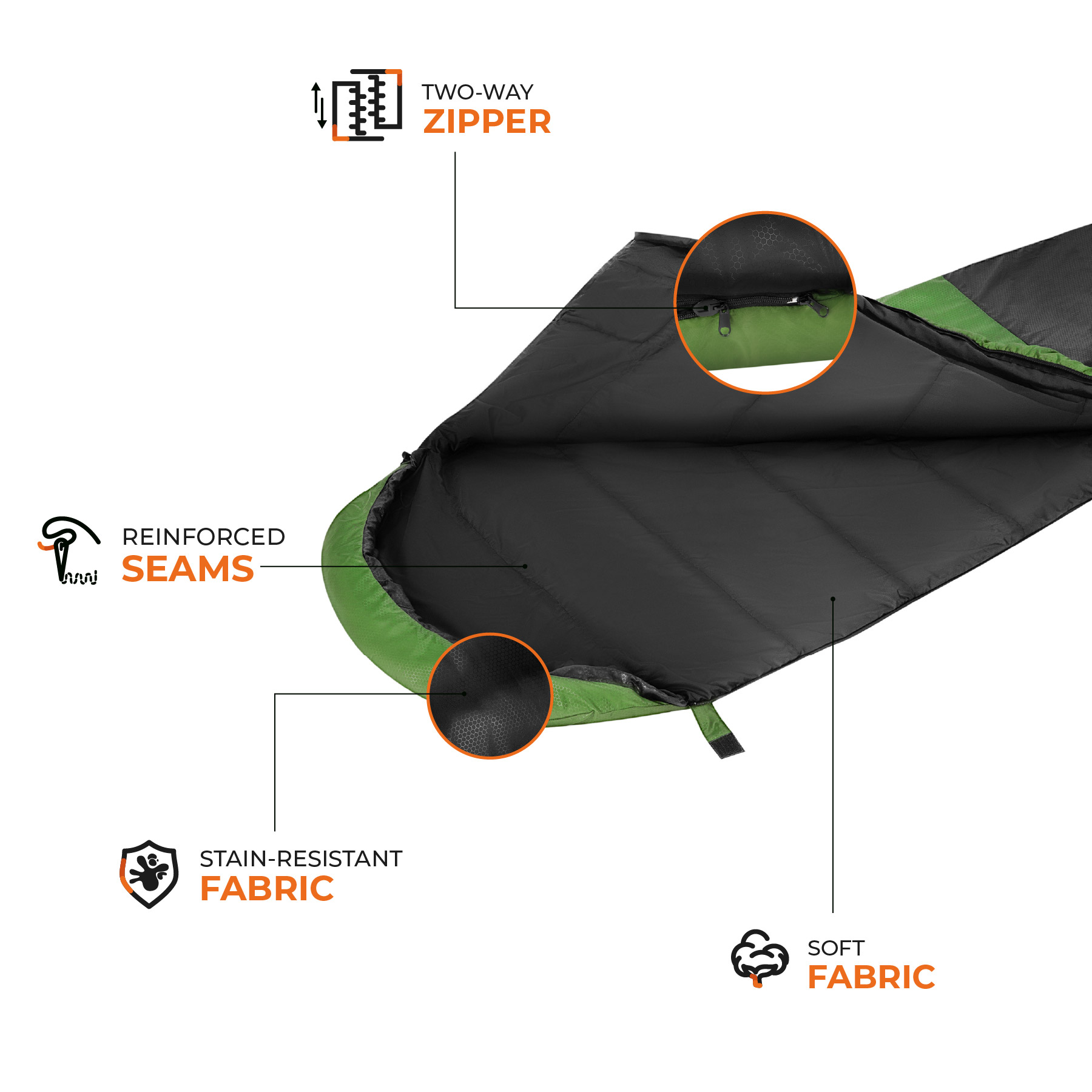 Specyfikacja: Kolor: czarno-zielony Materiał zewnętrzny: 210T poliester, odporny na zachlapania Materiał wewnętrzny: Soft micro fibre 240T Wypełnienie: podwójne, poliester 70 g/m2 Długość: 215 cm Szerokość: 75 cm Wymiary po złożeniu: 30 × 14 cm Wymiary po kompresji: 24 × 15 cm Temperatura komfortu: 5–20°C Temperatura ekstremalna: 0–5°C Zwężany kaptur: tak Wewnętrzna kieszeń: tak Zamek błyskawiczny: tak Rzep: tak Powłoka chroniąca przed zimnem i wilgocią: tak Uchwyty do zawieszenia: tak Waga: 710 g Uwagi: Nie przeznaczony do użytku komercyjnego Gwarancja: 24 miesiące Importer: Abisal Sp. z o.o.| Polska | 41-807 Zabrze | ul. Pyskowicka 17 | e-mail: [email protected] Abisal Sp. z o.o. deklaruje, iż produkty sprzedawane przez firmę są bezpieczne i spełniają wymagania zawarte w Ustawie o ogólnym bezpieczeństwie produktów z dnia 12 grudnia 2003r. (Dz.U. z dnia 31 grudnia 2003r.)