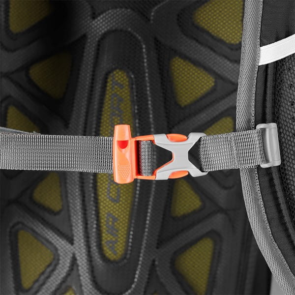 Na klamrze spinającej pas piersiowy umieszczony jest zintegrowany gwizdek ratunkowy, zwiększający bezpieczeństwo w nagłych wypadkach. Pas biodrowy nie tylko równomiernie rozkłada ciężar, ale również stabilizuje plecak, dodatkowo oferując kieszonki na drobne przedmioty, takie jak przekąski, klucze, czy telefon.