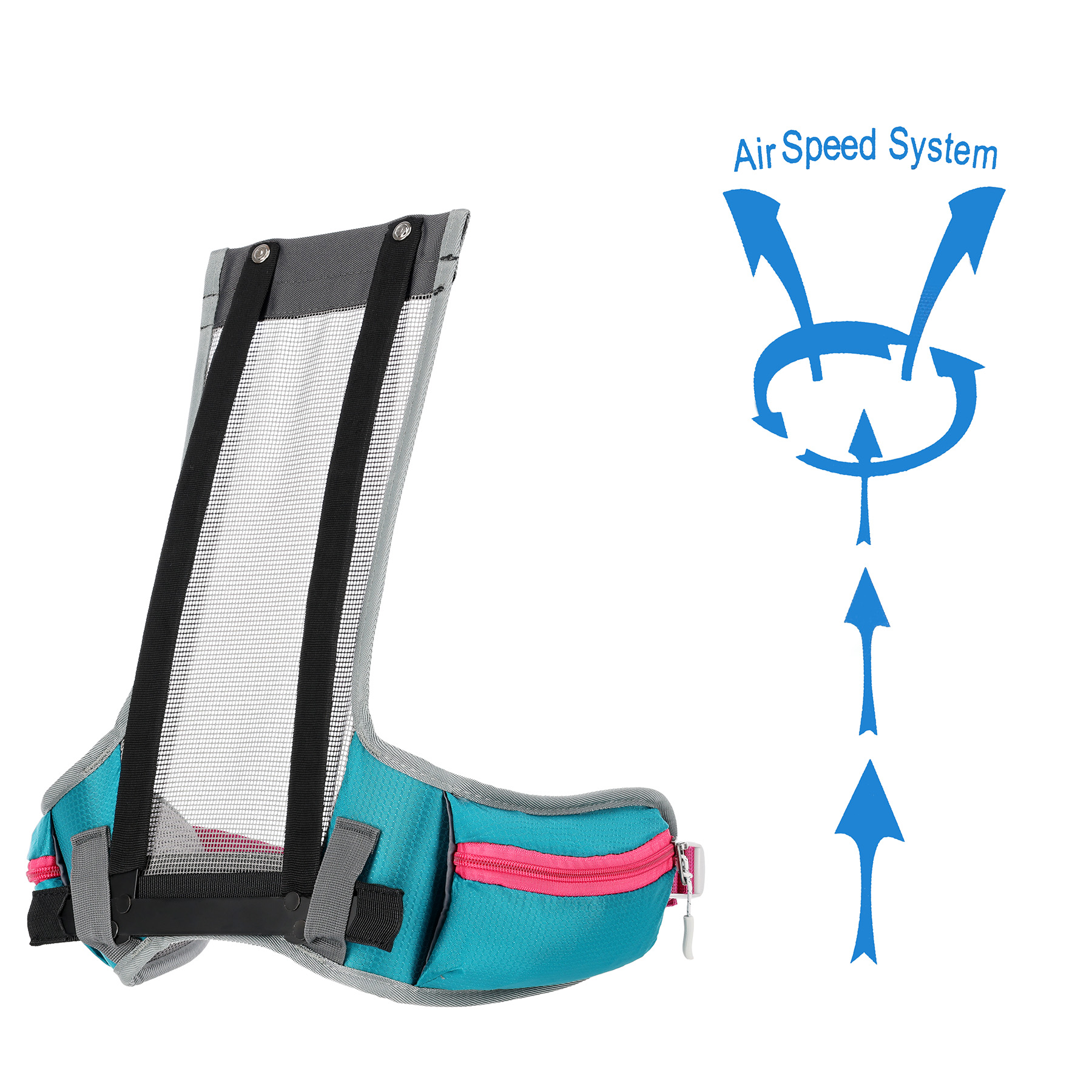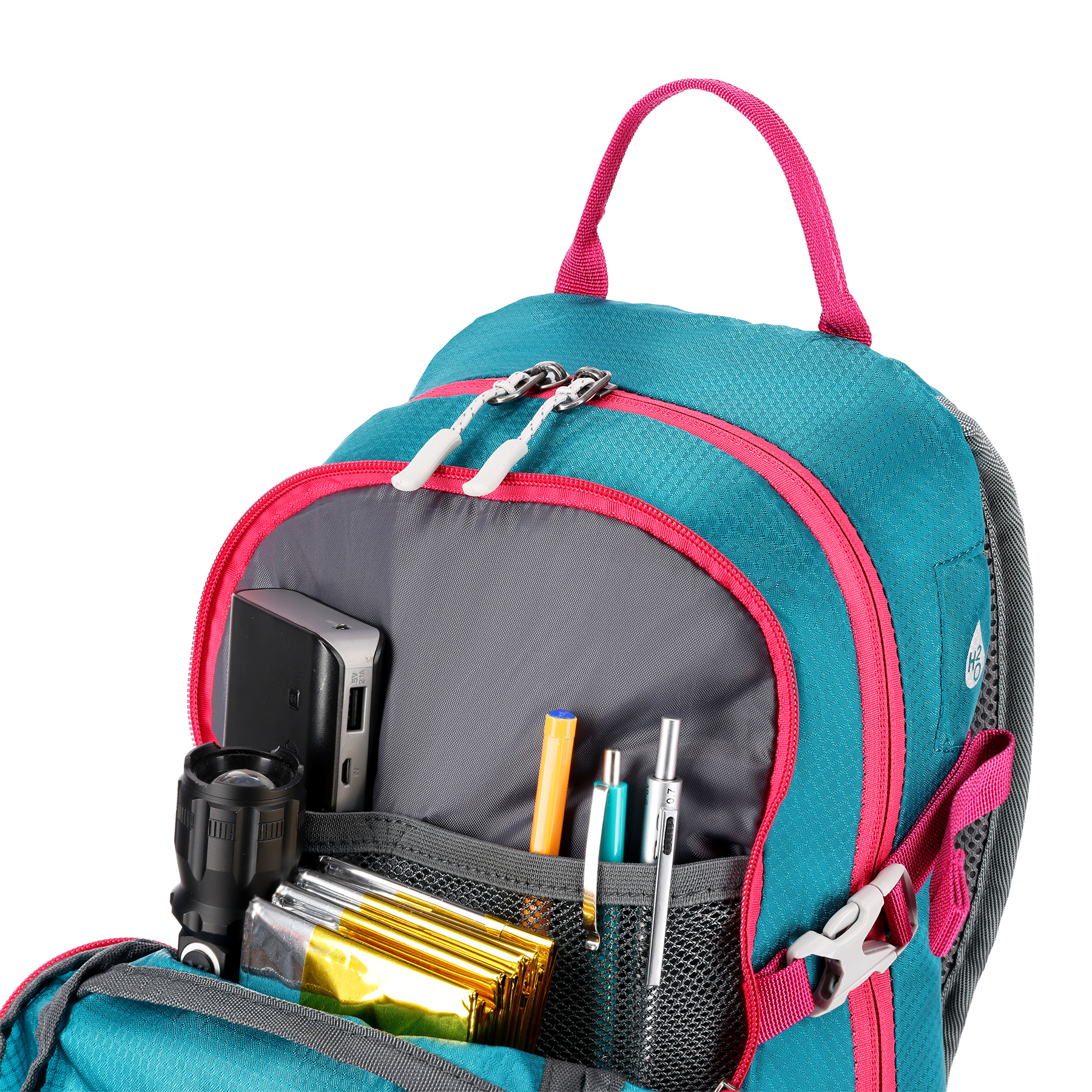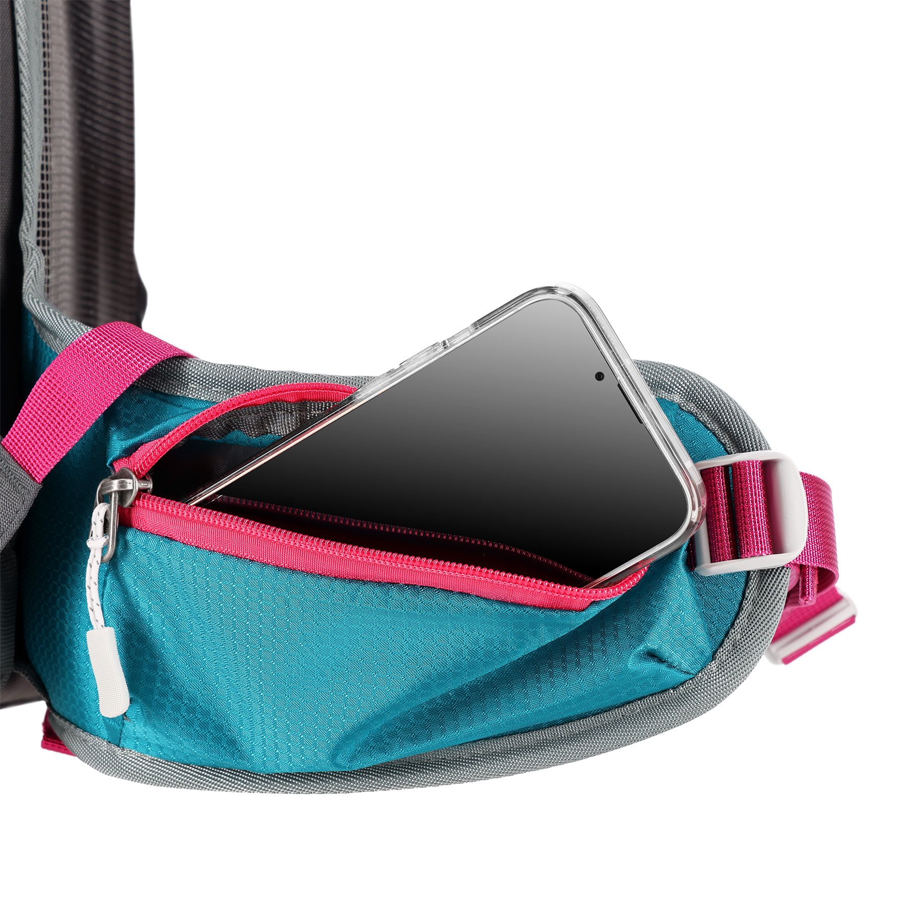 Na klamrze spinającej pas piersiowy umieszczono zintegrowany gwizdek ratunkowy, który zwiększa bezpieczeństwo w nagłych sytuacjach. Plecak oferuje również dodatkowy panel uchwytów na różne akcesoria, dwie boczne kieszenie z siatki oraz kieszenie na zamek w pasie biodrowym, idealne do przechowywania telefonu lub innych małych przedmiotów.