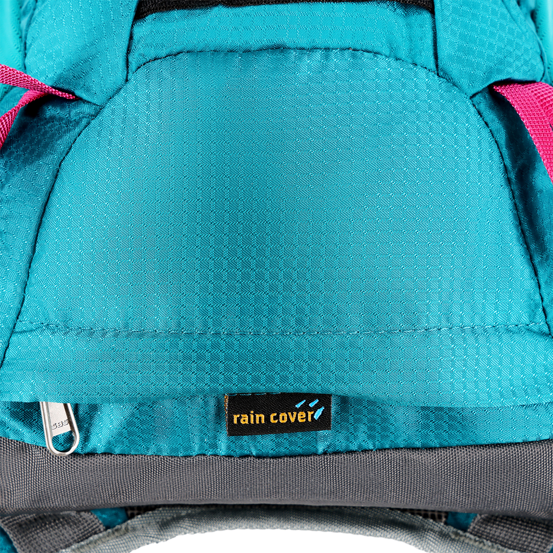 Plecak wykonany jest z materiałów, które chronią przed lekkim deszczem. W dolnej kieszeni znajduje się schowany przeciwdeszczowy pokrowiec, który zapewnia ochronę przed mocnymi opadami deszczu, a jego szybki montaż gwarantuje, że Twoje rzeczy pozostaną suche.