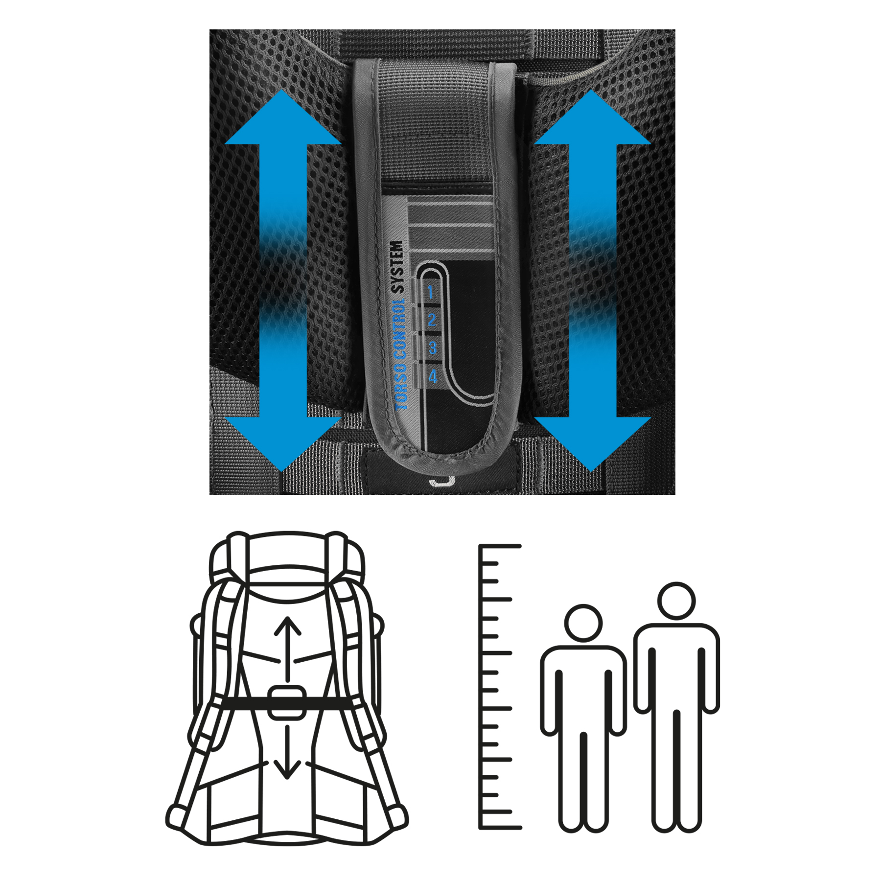 Kluczowym wyróżnikiem modelu jest system regulacji Control TORSO, który umożliwia precyzyjne dopasowanie wysokości pleców do wzrostu użytkownika. Dzięki temu ciężar plecaka jest prawidłowo rozłożony, co znacząco zwiększa komfort noszenia i stabilność podczas wielogodzinnych marszów.