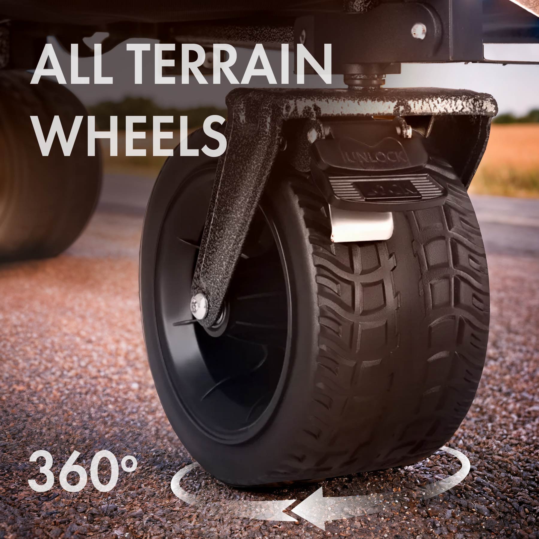 Wózek został wyposażony w solidne koła o wymiarach 7 x 4 cala, wykonane z połączenia tworzywa PP i PVC. Takie zestawienie gwarantuje dobrą przyczepność, stabilność i płynność jazdy – zarówno na twardych nawierzchniach, jak i na piasku czy trawie. Dzięki temu NC2604 świetnie sprawdza się w zróżnicowanym terenie.