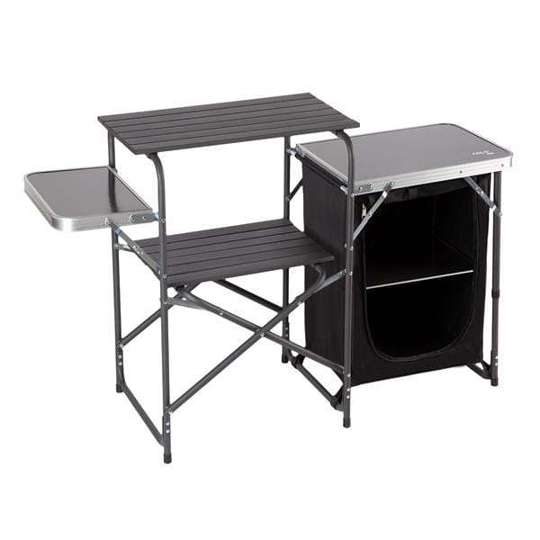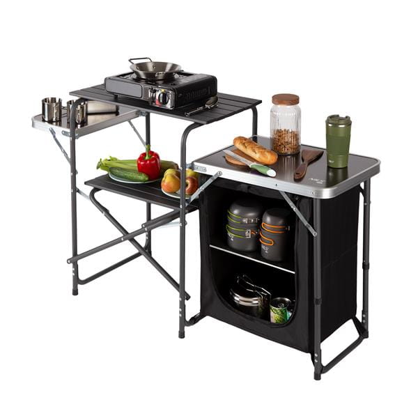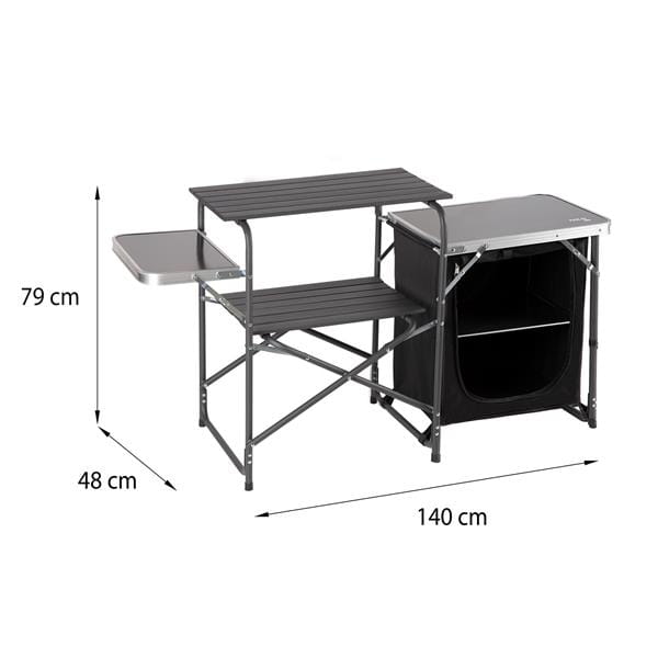 To wyjątkowe rozwiązanie dla miłośników kempingu, którzy cenią sobie komfort i funkcjonalność. Wytrzymała konstrukcja szafki połączona z eleganckim designem sprawia, że jest to must-have każdego podróżnika. Składane, boczne blaty oferują przestrzeń nie tylko do przygotowania posiłków, ale także do ich serwowania. Dzięki otwartym półkom i przestronnej szafce zamykanej na zamek błyskawiczny, przechowywanie produktów spożywczych jest nie tylko wygodne, ale i bezpieczne. Gdy potrzebujesz więcej miejsca, blaty możesz z łatwością złożyć, co czyni szafkę jeszcze bardziej kompaktową. Niezależnie od tego, czy planujesz grilla, piknik czy kameralne spotkanie wśród natury, nasza szafka turystyczna z osłoną sprawdzi się idealnie.