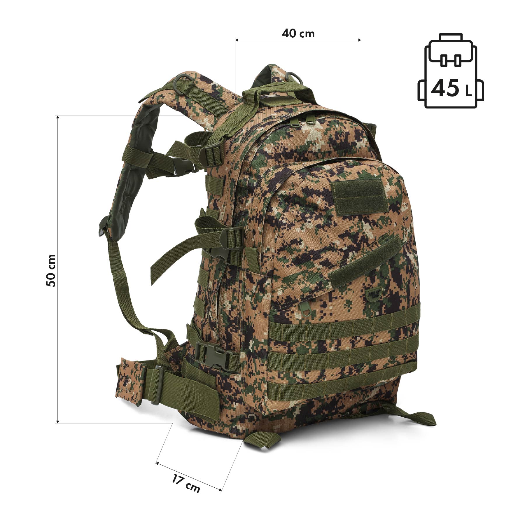 NC3904 Vanguard to plecak militarny o pojemności 45 litrów, zaprojektowany z myślą o użytkownikach ceniących funkcjonalność, lekkość i nowoczesny wygląd tactical. Idealnie sprawdzi się podczas jednodniowych wypraw, wypadów survivalowych, a także jako plecak miejski lub EDC (Everyday Carry) – czyli codzienny plecak na niezbędne przedmioty, które chcesz mieć zawsze przy sobie. Kompaktowe wymiary w połączeniu z przemyślaną konstrukcją czynią go doskonałym wyborem na co dzień i na wyprawy w teren.