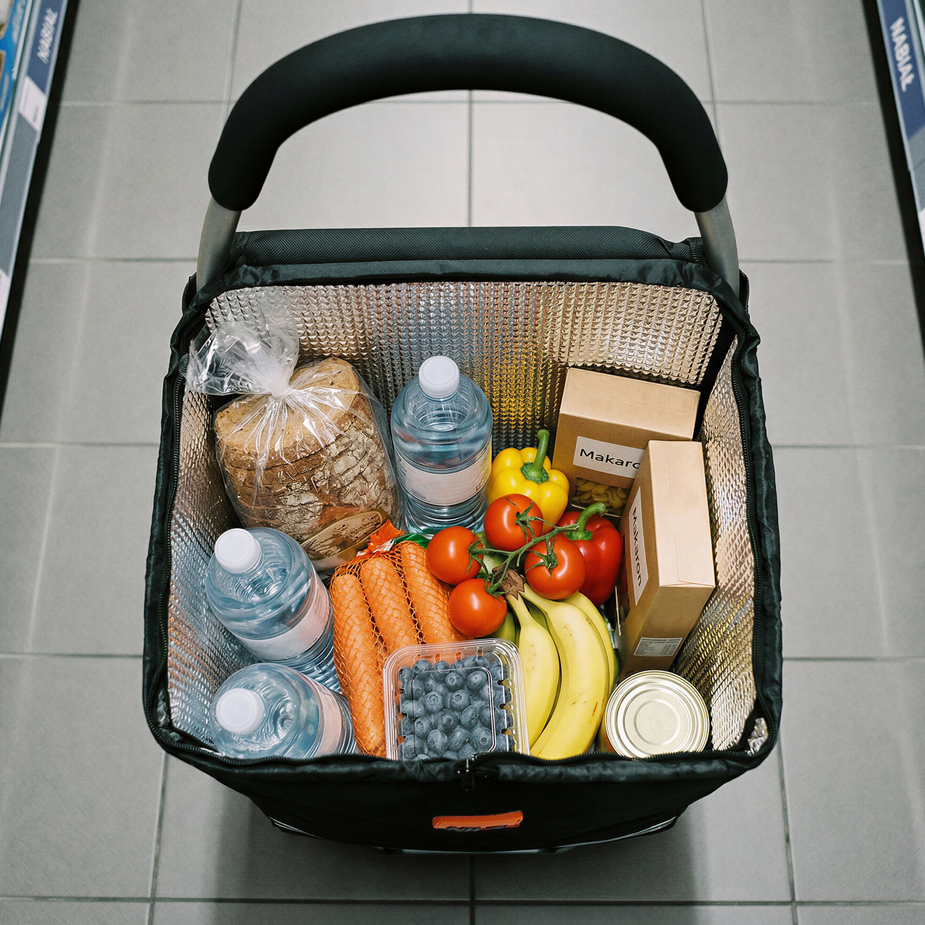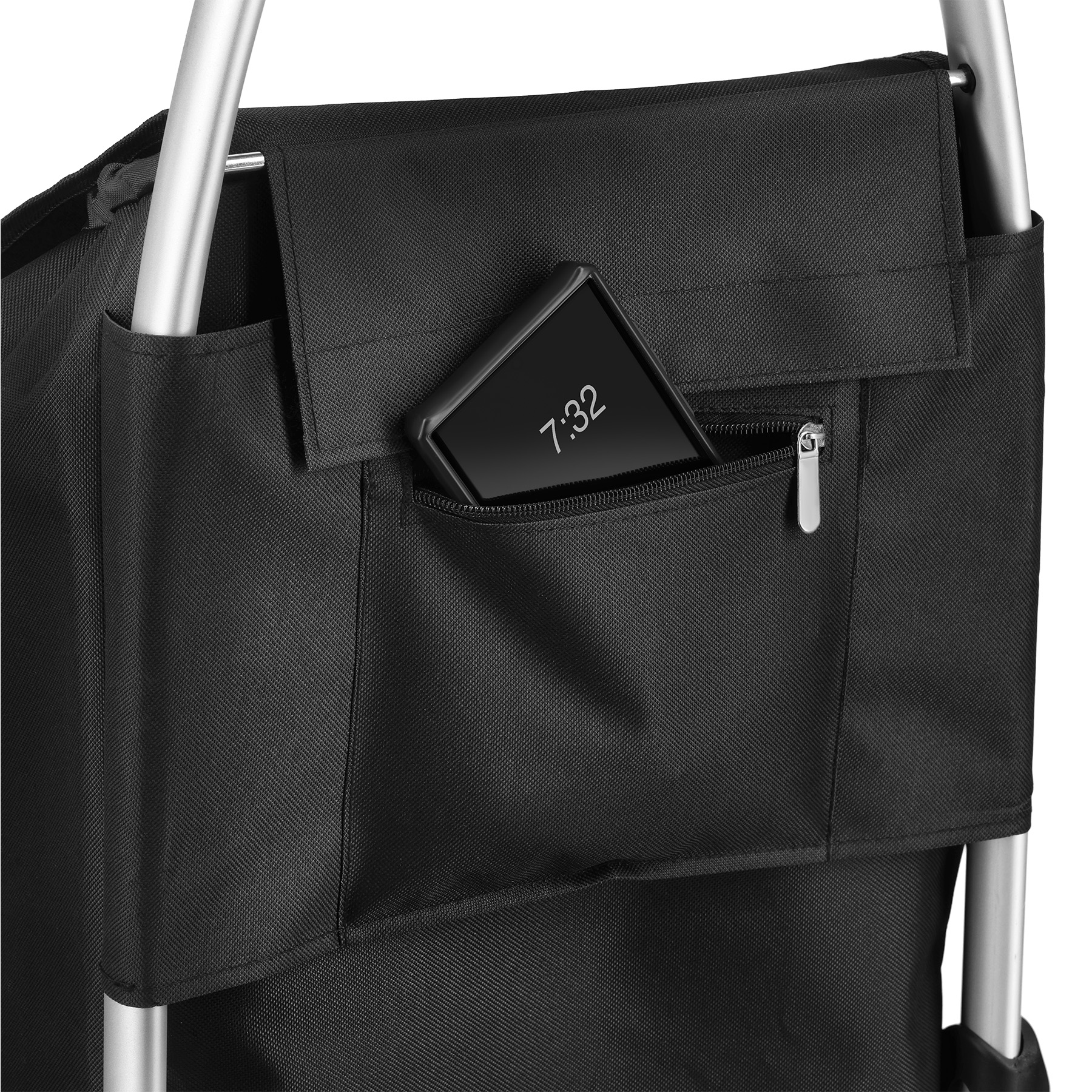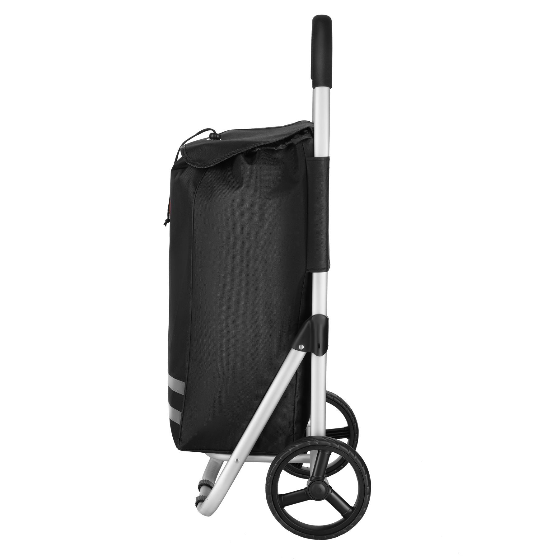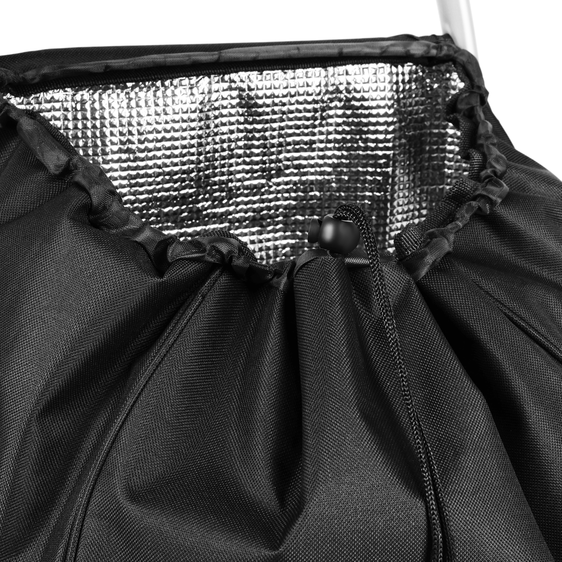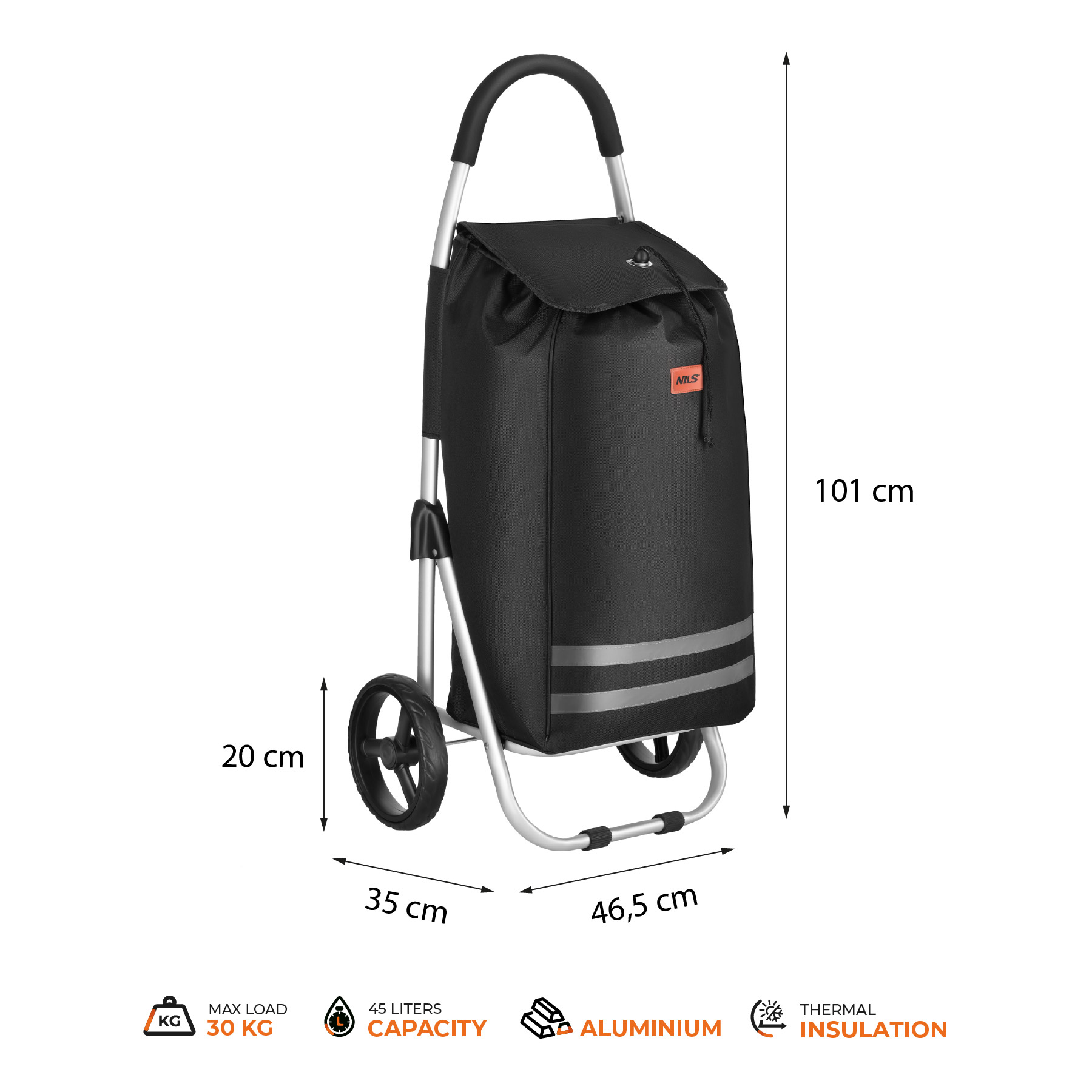 Wózek oparto na aluminiowym stelażu, który zapewnia stabilność i trwałość przy zachowaniu niskiej wagi. Torba wykonana z wytrzymałego poliestru 900D posiada właściwości termoizolacyjne, co pomaga utrzymać temperaturę produktów. Pojemność ok. 45 litrów pozwala wygodnie spakować większe zakupy, a maksymalne obciążenie do 30 kg odciąża ręce i kręgosłup.