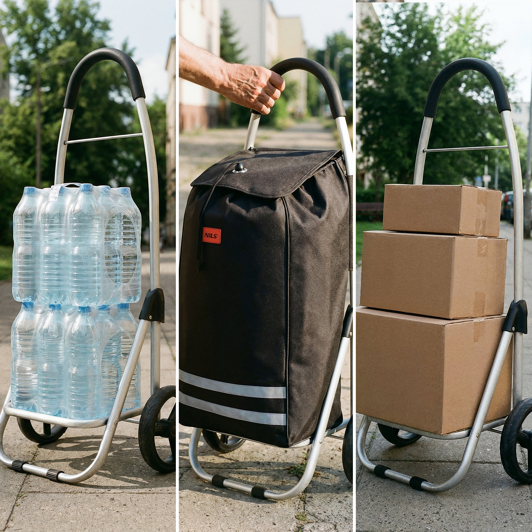 NC4304 WÓZEK NA ZAKUPY CZARNY NILS to nowoczesny, składany wózek zakupowy, który łączy dużą pojemność, lekką konstrukcję i wygodę codziennego użytkowania. Świetnie sprawdzi się podczas większych zakupów, wizyty na targu, wyjazdu na działkę czy poruszania się po mieście – jako praktyczna alternatywa dla noszenia ciężkich toreb.