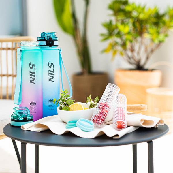 Butelka tritanowa NCD04 marki Nils CAMP cechuje niezwykłe połączenie trwałości, ergonomii kształtu i funkcjonalności. Tritanowa butelka została zaprojektowana tak, aby mogła nam towarzyszyć przez cały dzień. Dzięki znajdującej się na tylnej ścianie butelki przedziałce możemy monitorować na bieżąco poziom naszego nawodnienia. Niewątpliwym atutem NCD04 jest wewnętrzny wkład na owoce w postaci koszyczka, dzięki któremu nawodnienie organizmu będzie jeszcze bardziej efektywne i skuteczne. NCD04 posiada również szczelny i wygodny ustnik oraz innowacyjny system otwierania. Aby móc się napić, należy przesunąć zawleczkę w dół i wcisnąć przycisk – wtedy blokada otworu się zwalnia. Natomiast, żeby zablokować otwór, wystarczy przesunąć z powrotem zawleczkę ku górze. Dodatkowo butelka posiada plastikowy uchwyt oraz pasek na nadgarstek. Obydwa rozwiązania świetnie sprawdzą się podczas transportu. Całość prezentuje się niezwykle praktycznie i oryginalnie.