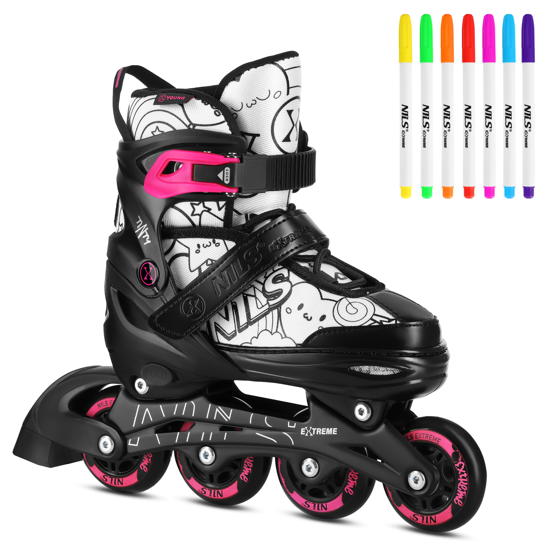 NH10907 TINTY NILS EXTREME to regulowane łyżworolki dla dzieci, które chcą rozpocząć naukę jazdy w kreatywny i angażujący sposób. Model wyróżnia się funkcją 4w1, dzięki której jeden zestaw można skonfigurować jako łyżwy, łyżworolki, wrotki lub rolko-wrotki. To praktyczne rozwiązanie, które pozwala dopasować sprzęt do etapu nauki oraz preferowanej formy aktywności.