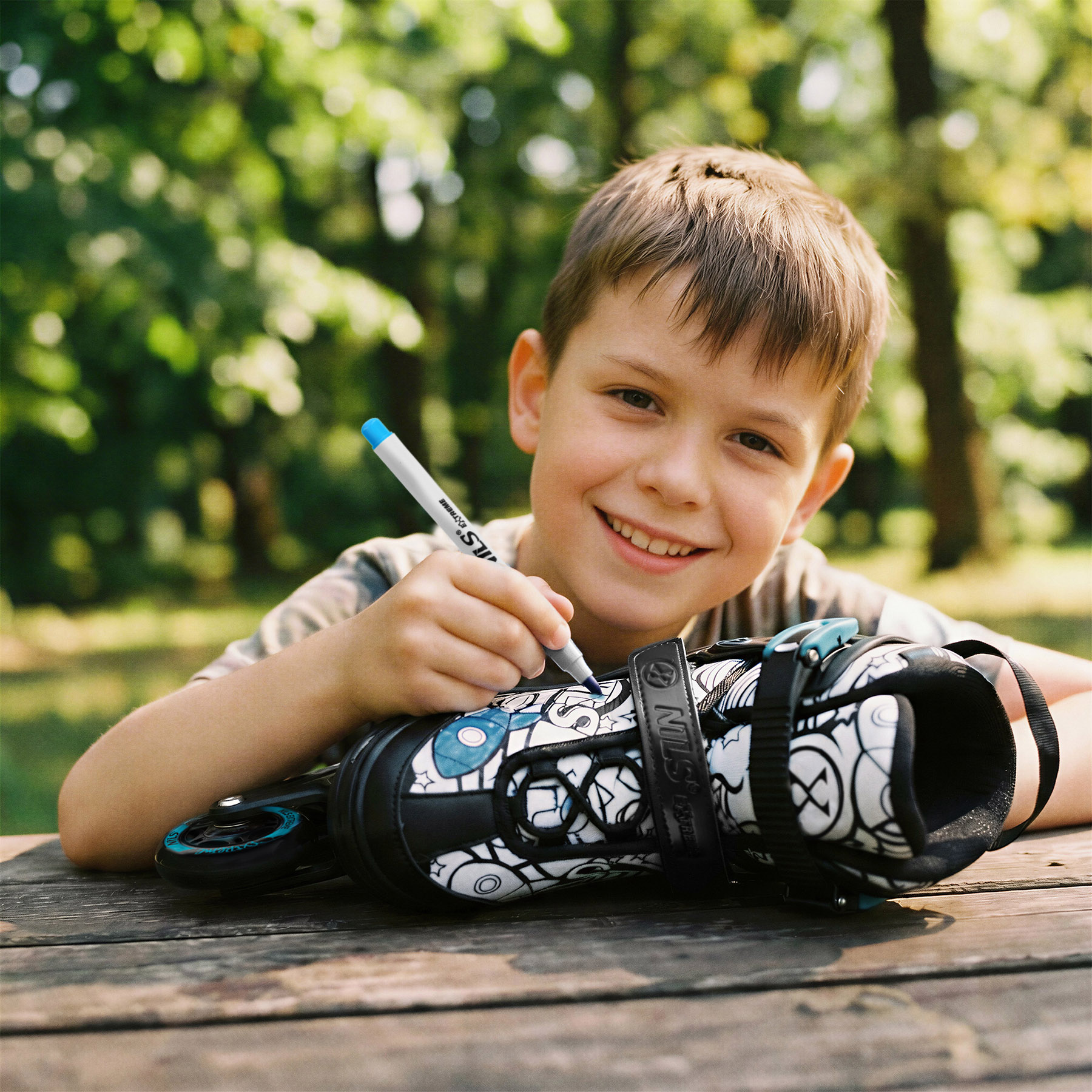 TINTY to nie tylko funkcjonalność, ale także zabawa i możliwość wyrażenia siebie. W zestawie znajduje się 7 permanentnych markerów, którymi dziecko może samodzielnie pokolorować wzór na bucie i nadać mu indywidualny charakter. Dzięki temu każda para może wyglądać inaczej, a sama nauka jazdy staje się jeszcze ciekawsza.