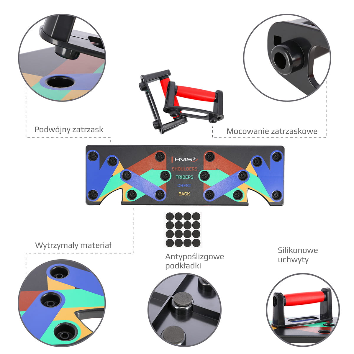 PU10 MULTI marki HMS, to innowacyjna i wielofunkcyjna deska, służąca do wykonywania ugięć ramion w podporze przodem, czyli tzw. pompek.
