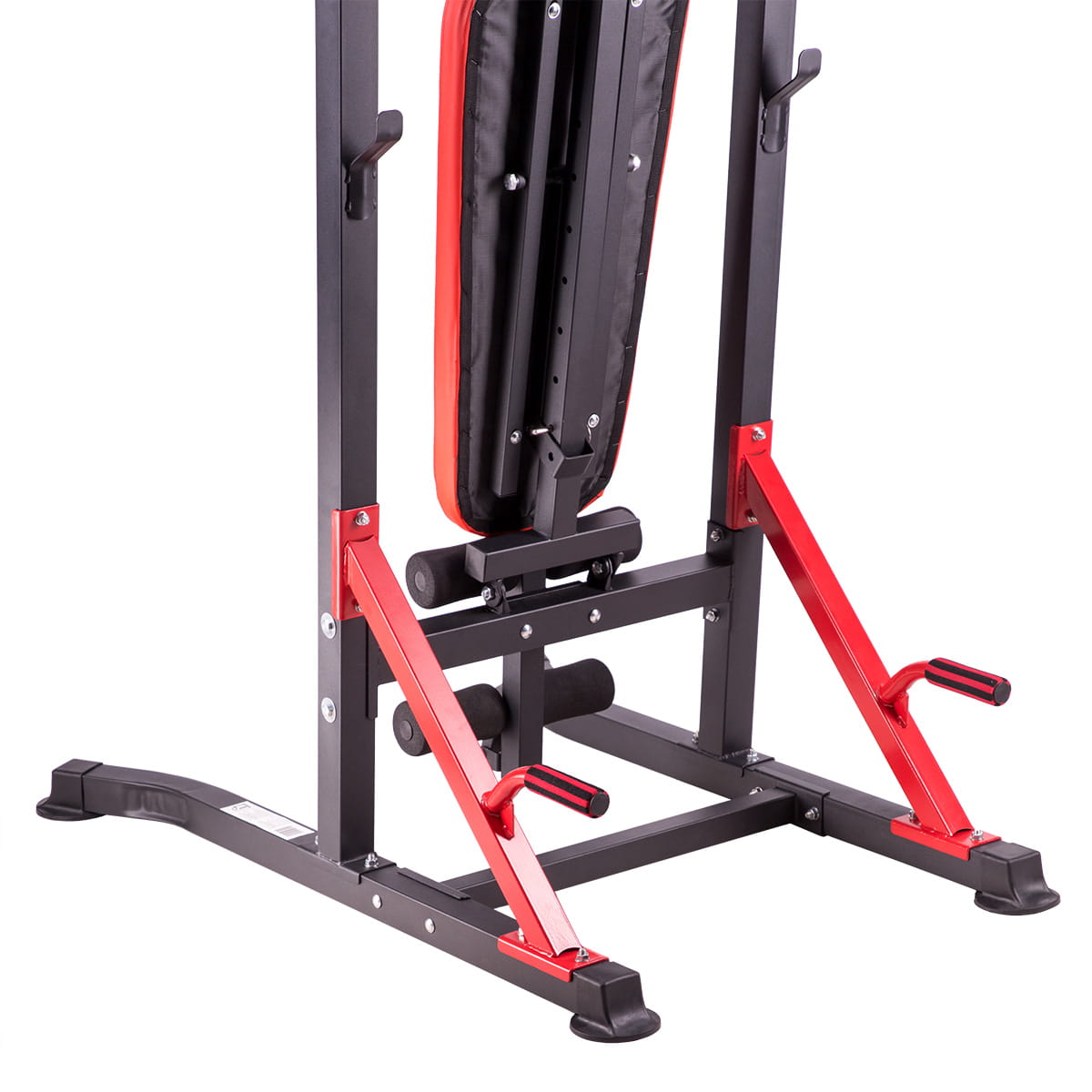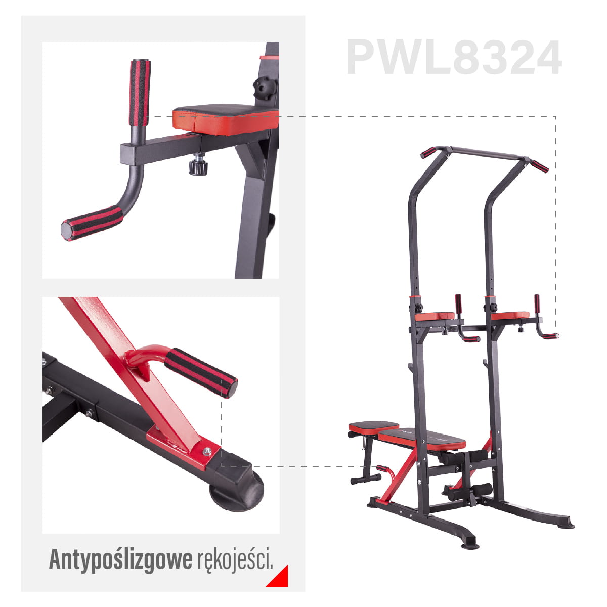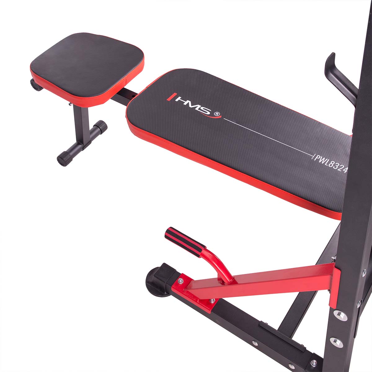 PWL8324 HMS, pozwoli wykonać ćwiczenia na wszystkie grupy mięśniowe górnych partii ciała. Konstrukcja produktu umożliwia wykonanie bardzo dużej ilości ćwiczeń. Użytkownik ma do dyspozycji drążek, poręcze do tzw. dipów, ławeczkę z obszernymi możliwościami regulacji jej ustawień, podpórki do pompek, a także haki na których można umieścić sztangę. Wszystkie elementy pozwolą wykonać pełny, obszerny trening na klatkę piersiową, plecy, barki, biceps, triceps oraz brzuch.