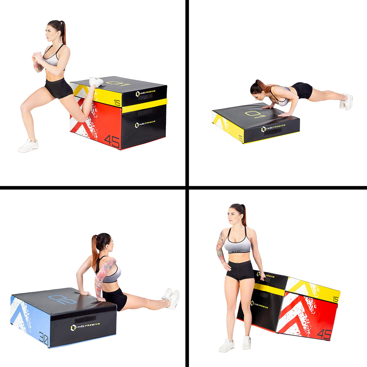 PYBS01 HMS PREMIUM, to zestaw czterech miękkich skrzyń plyometrycznych, o różnych wymiarach.