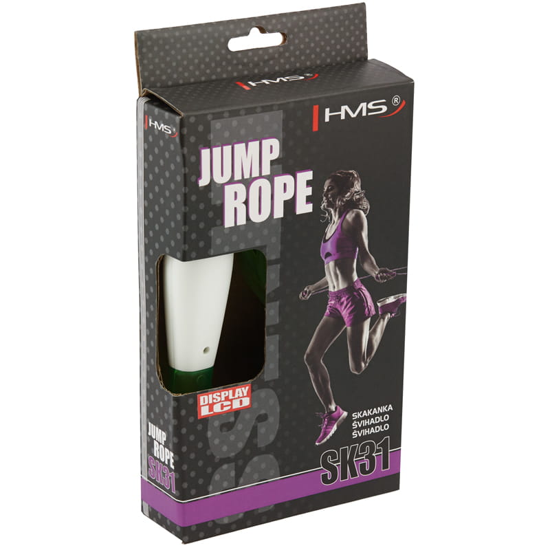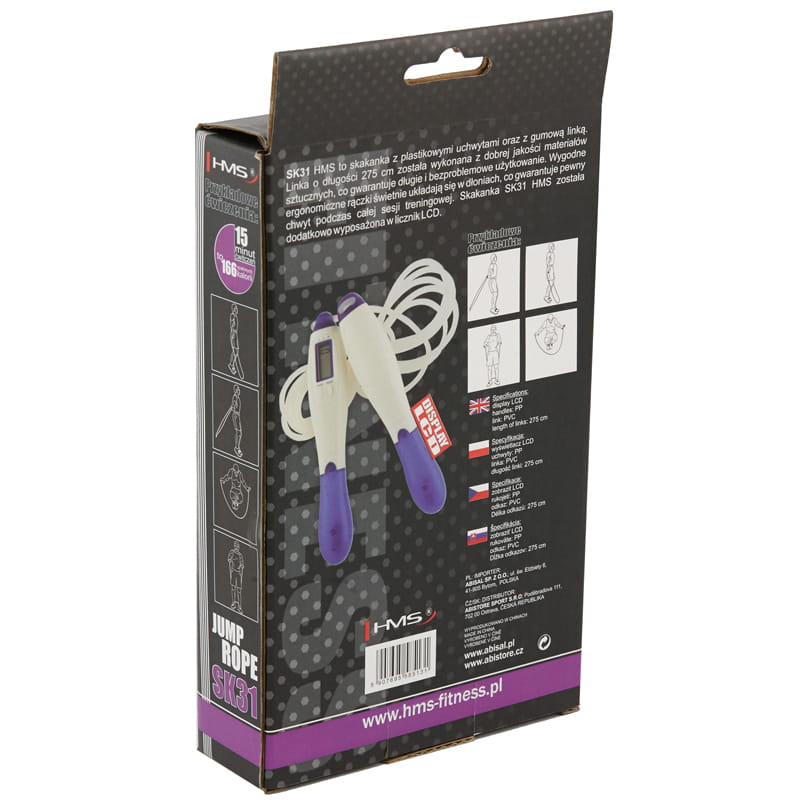 SK31 HMS - to skakanka z linką oraz rączkami wykonanymi z wytrzymałego materiału. Produkt dodatkowo wyposażono w licznik LCD z trzema funkcjami: kalorie, dystans, ilość powtórzeń. Linka o długości 275cm została wykonana ze wysokiej jakości tworzywa PCV, zapewniając tym samym długie i bezproblemowe użytkowanie. Wygodne, ergonomiczne rączki świetnie układają się w dłoniach, gwarantując pewny chwyt podczas całej sesji treningowej. Ćwiczenia przy użyciu skakanki SK31 szybko poprawią kondycję fizyczną i koordynację ruchową. Pozwolą spalić maksymalną ilość kalorii, a tym samym wyszczuplić sylwetkę.
