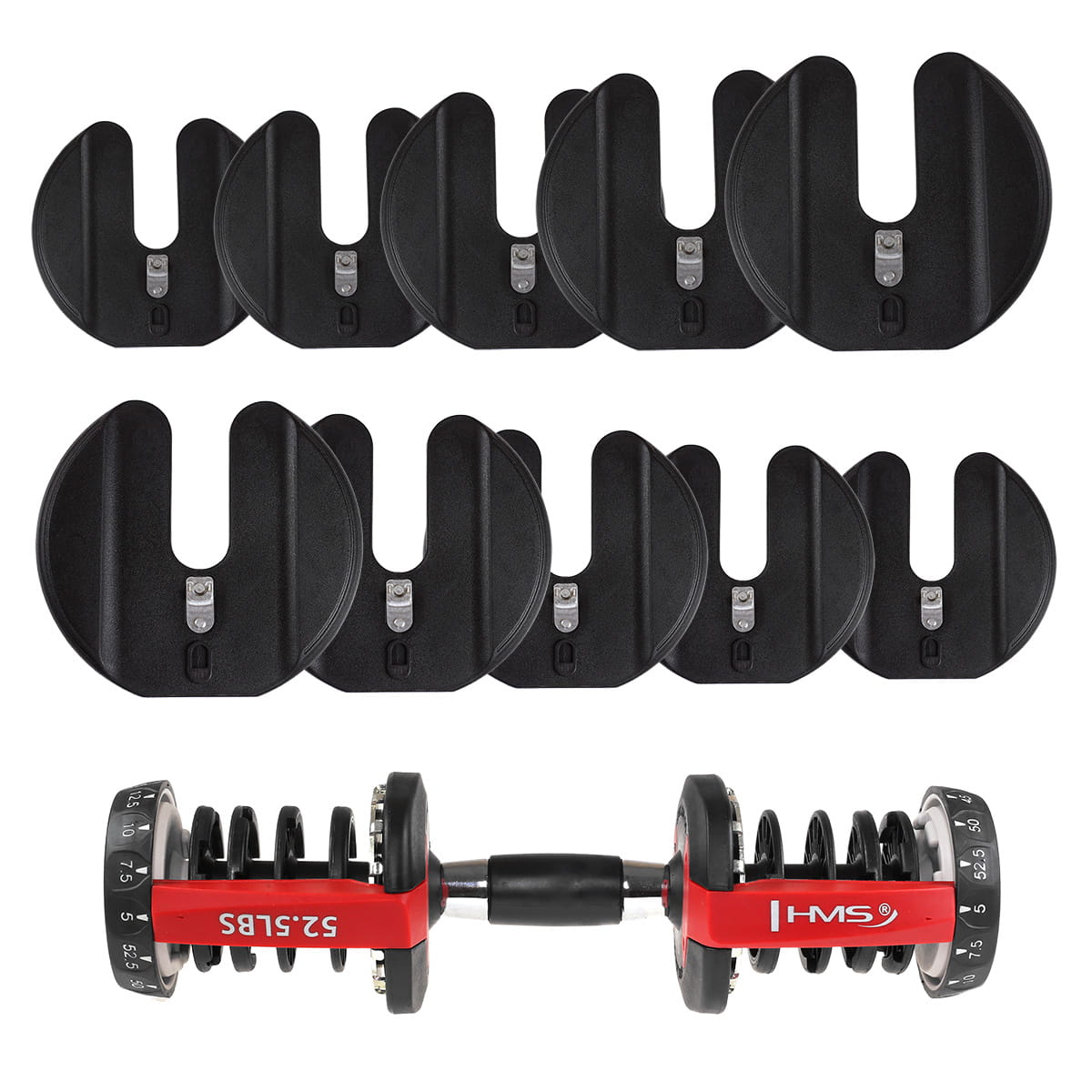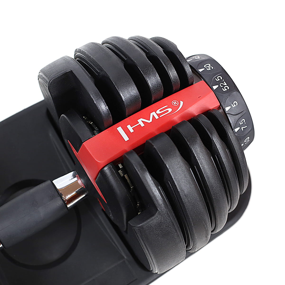 SR52 HMS to regulowana sztangielka. Zestaw zawiera gryf, 10 talerzy oraz podstawkę. Przyrząd jest idealnym rozwiązaniem dla osób ćwiczących w domu, ale z powodzeniem sprawdzi się też na sali treningowej, zastępując cały stojak tradycyjnych hantli. Zastosowanie innowacyjnego systemu montowania talerzy umożliwia bardzo szybką i łatwą zmianę obciążenia w trakcie treningu. W przeciwieństwie do tradycyjnych hantli, zdjęcie i założenie talerzy nie wymaga każdorazowego odkręcania zacisków oraz nakładania i zdejmowania talerzy. W SR52 wystarczy odłożyć sztangielkę na podstawkę i dwoma pokrętłami ustawić pożądane obciążenie. Po ponownym podniesieniu sztangielki będą znajdować się na niej talerze odpowiadające wybranemu ustawieniu. Produkt został wykonany z materiałów najwyższej jakości. Dużym atutem SR52 HMS jest uchwyt sztangielki, o ergonomicznym kształcie, pokryty materiałem antypoślizgowym. Regulowane sztangielki marki HMS stanowią innowacyjne rozwiązanie dla miłośników sportów siłowych - 10 talerzy pozwala na dowolną regulację obciążenia w zależności od potrzeb użytkownika. Uwaga: wszystkie wartości obciążenia znajdujące się na produkcie podane są w funtach (lbs). 1 funt = 0,45 kg