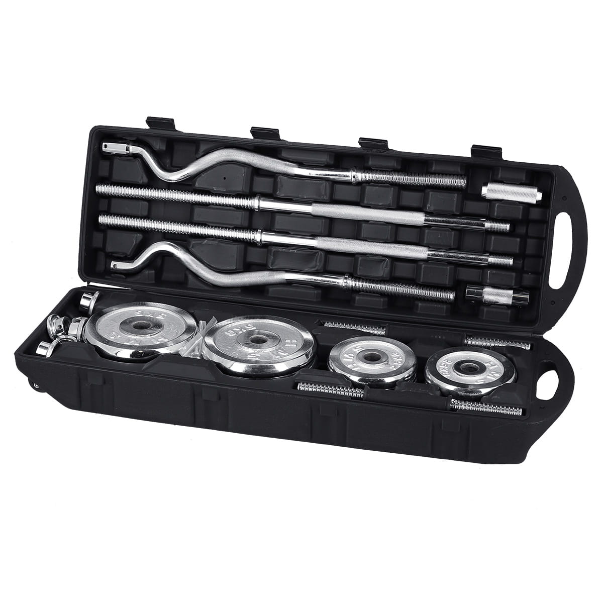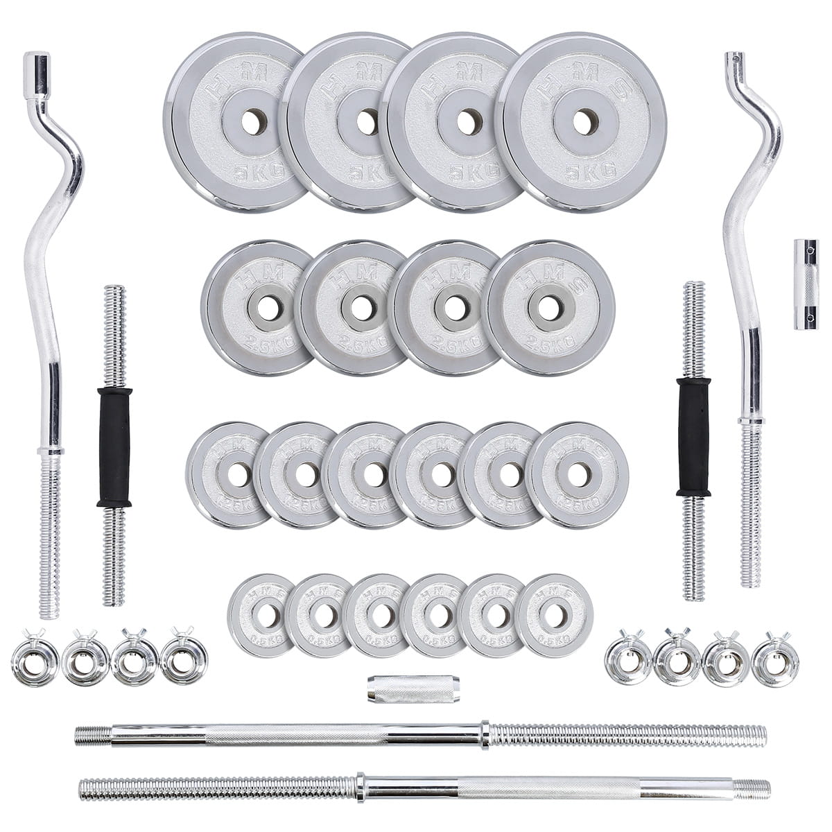 W skład zestawu wchodzą dwa krótkie gryfy, długi skręcany gryf, gryf łamany, średni gryf, który powstaje po połączeniu dwóch krótkich, osiem zacisków i łącznie 20 talerzy obciążeniowych. Całość znajduje się w wygodnej walizce. Łączna waga zestawu to 55 kg, dlatego dla łatwiejszego transportu, walizka posiada kółka, co pomaga w przemieszczaniu się ze sprzętem.