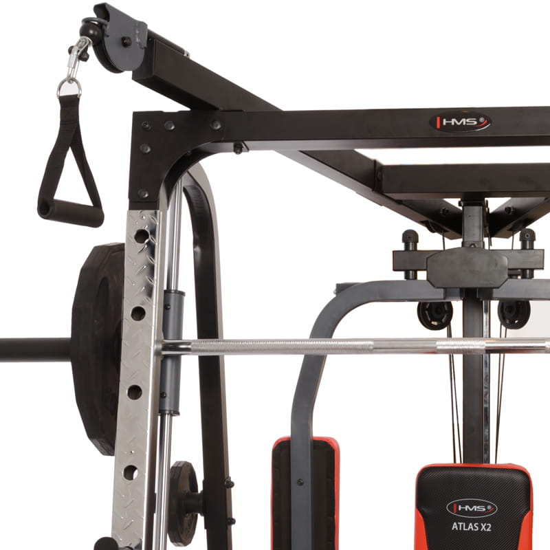 Atlas X2 HMS to najwyższy model suwnicy Smitha w ofercie marki. Jej nowoczesna i wielofunkcyjna konstrukcja usatysfakcjonuje nawet najbardziej wymagających użytkowników. Suwnica Atlas X2 HMS to urządzenie do kompleksowego treningu całego ciała. Jego wszechstronne wyposażenie pozwala harmonijnie rozwijać zarówno górne, jak i dolne partie mięśniowe. Tylko od użytkownika zależy, jak zbuduje swój zestaw ćwiczeń w poszukiwaniu optymalnej formuły treningu. Atlas X2 HMS zawiera suwnicę Smitha, wyciąg dolny, przyrząd do motylków oraz do ćwiczenia mięśni nóg. W porównaniu do suwnicy Atlas X1, posiada łożyska, za sprawą których mechanizm suwnicy działa niezwykle płynnie oraz dwa rodzaje wyciągów górnych, uchwyty do zawieszenia wolnych ciężarów oraz modlitewnik z dźwignią do ciężarów. Tak szeroki wachlarz przyrządów w połączeniu z możliwością korzystania z wolnych ciężarów, czyni z niej idealne urządzenie dla osób poważnie myślących o systemowym rozwoju muskulatury ciała. Centralnym elementem suwnicy jest odłączana ławka - można ją wypiąć z zestawu i ćwiczyć w pozycji stojącej. To ona w dużym stopniu odpowiada za komfort treningu, dlatego też została wyposażona w wielostopniowy mechanizm regulacji siedziska i oparcia. O pozytywne wrażenia użytkownika dbają również: wytrzymała gąbka oraz nowoczesna i trwała tkanina obiciowa o karbonowym wzorze. Dzięki swoim właściwościom skutecznie odciążają kręgosłup i stabilizują jego pozycję, dzięki czemu nawet bardzo intensywny trening nie stanowi problemu. Wysoka jakość wykonania suwnicy Atlas X2 HMS gwarantuje bezproblemową eksploatację przez długi czas i przywodzi na myśl o wiele droższe produkty. Począwszy od ramy zbudowanej z wytrzymałej, malowanej proszkowo stali, poprzez wykończenie tapicerskie, po system kół pasowych i linek naciągowych, urządzenie spełnia najwyższe standardy techniczne i estetyczne. Polecamy ją wszystkim osobom, poszukującym uniwersalnego i trwałego urządzenia do użytku domowego.
