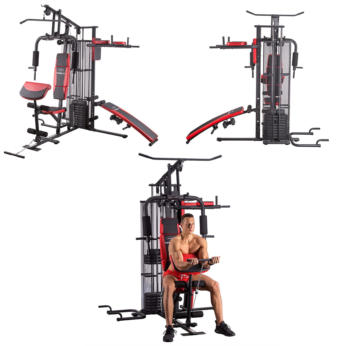 TYTAN 12 HMS - to nowoczesny atlas do ćwiczeń siłowych. Ten uniwersalny przyrząd z pewnością zadowoli nawet najbardziej wymagających użytkowników. Atlas łączy właściwości: ławki skośnej, modlitewnika, motylka, wyciągu dolnego i górnego, stacji do ćwiczenia mięśni nóg, stanowiska do intensywnego treningu mięśni brzucha oraz stacji do wykonywania pompek. Tak szeroki wachlarz funkcji, czyni z niego idealne urządzenie dla osób planujących systemowy rozwój muskulatury ciała. Tytan 12 posiada wygodne siedzisko. Komfort zapewnia wytrzymała gąbka oraznowoczesna tkanina obiciowa o karbonowym wzorze i podwyższonej trwałości. Specjalnie wyprofilowana konstrukcja stabilizuje pozycję użytkownika. Tytan 12 umożliwia bezpieczne wykonywanie ćwiczeń różnych partii mięśni - tak jak w profesjonalnej siłowni. Wysoka jakość gwarantuje bezproblemową eksploatację przez długi czas. Począwszy od ramy zbudowanej z wytrzymałej, malowanej proszkowo stali, po system kół pasowych i linek naciągowych. Urządzenie spełnia najwyższe standardy techniczne. Sprzęt umożliwia kształtowanie wszystkich grup mięśni: najszerszych grzbietu, piersiowych, trapezowych, posturalnych, pośladków, przedramion, naramiennych, tricepsu, pozwala również na ćwiczenie nóg.