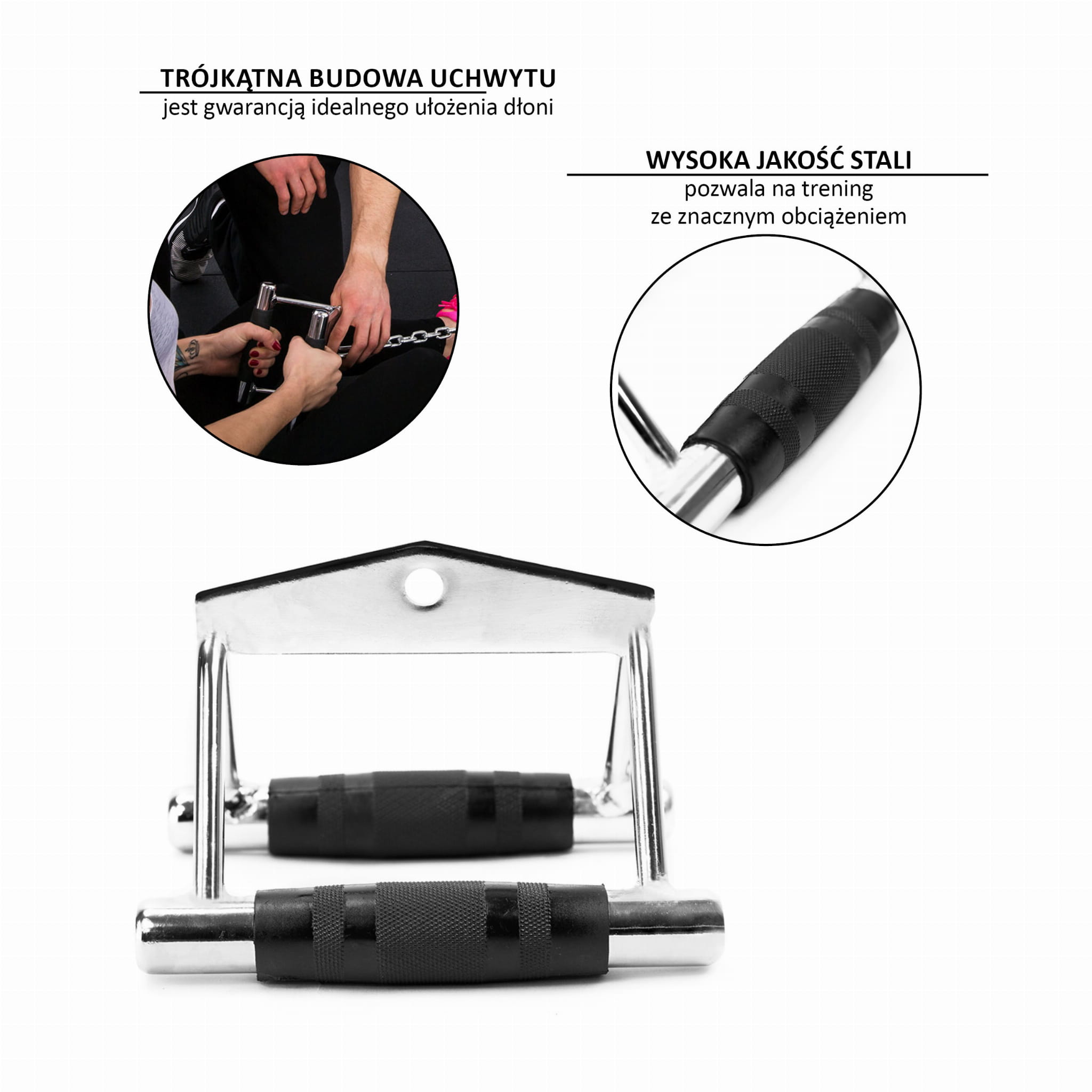 Trójkątna budowa uchwytu jest gwarancją idealnego ułożenia dłoni i wymuszenia przy tym prawidłowego ruchu w trakcie wykonywanego ćwiczenia. Ogumowana rękojeść zapewnia pewny chwyt oraz zapobiega wyślizgnięciu się przyboru z ręki, jednocześnie wymagając od nas mocniejszego chwytu. Dzięki temu pracujemy również nad rozbudową mięśni przedramienia. Niezbyt szeroki rozstaw rękojeści, ułatwia utrzymanie prawidłowego toru ruchu, czyli prowadzenie łokci blisko tułowia. UW04 jest wykonany z wysokiej jakości stali chromowanej, co pozwala na trening ze znacznym obciążeniem.