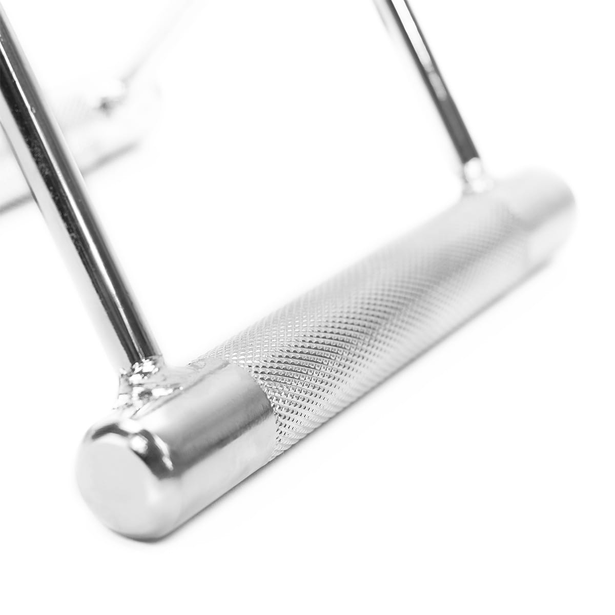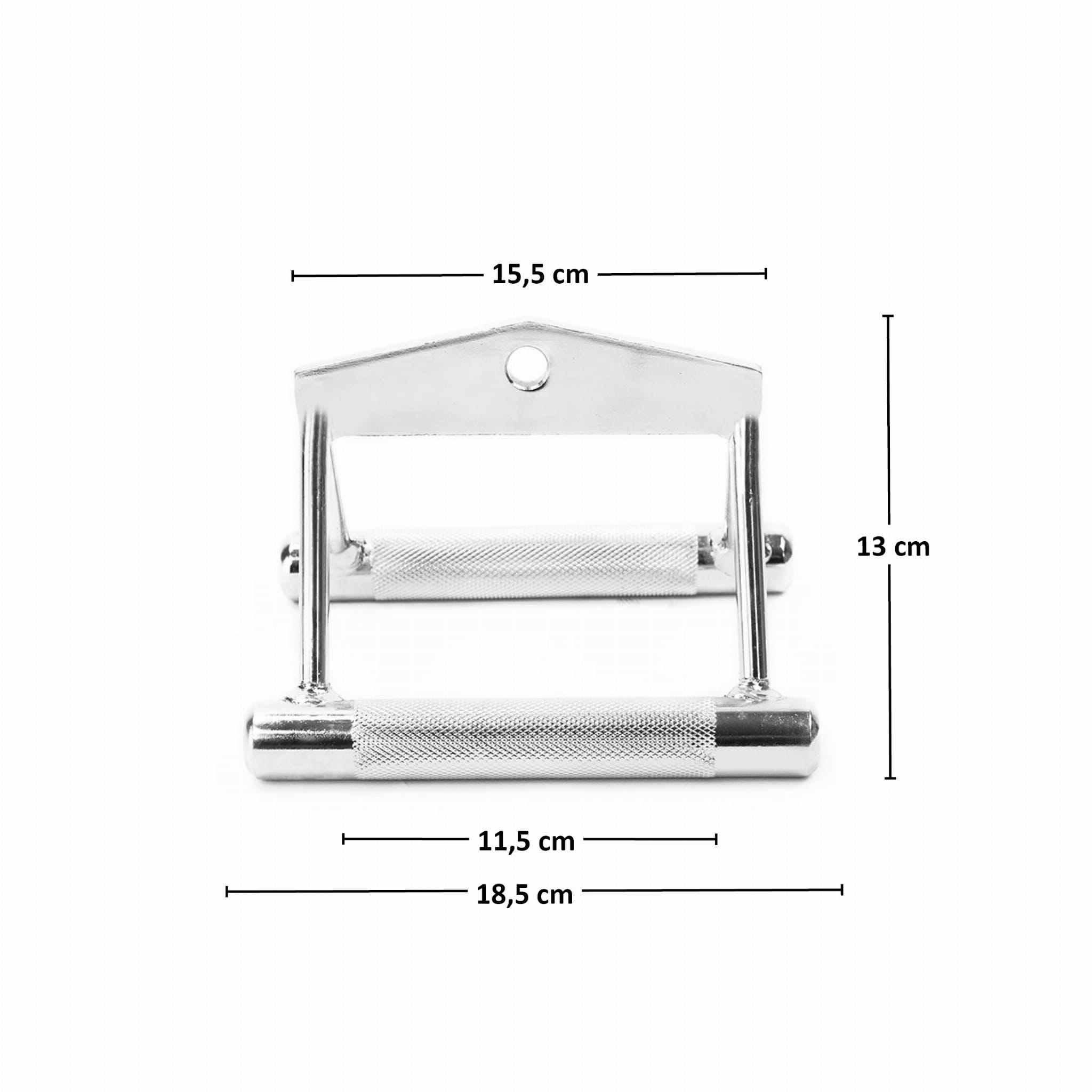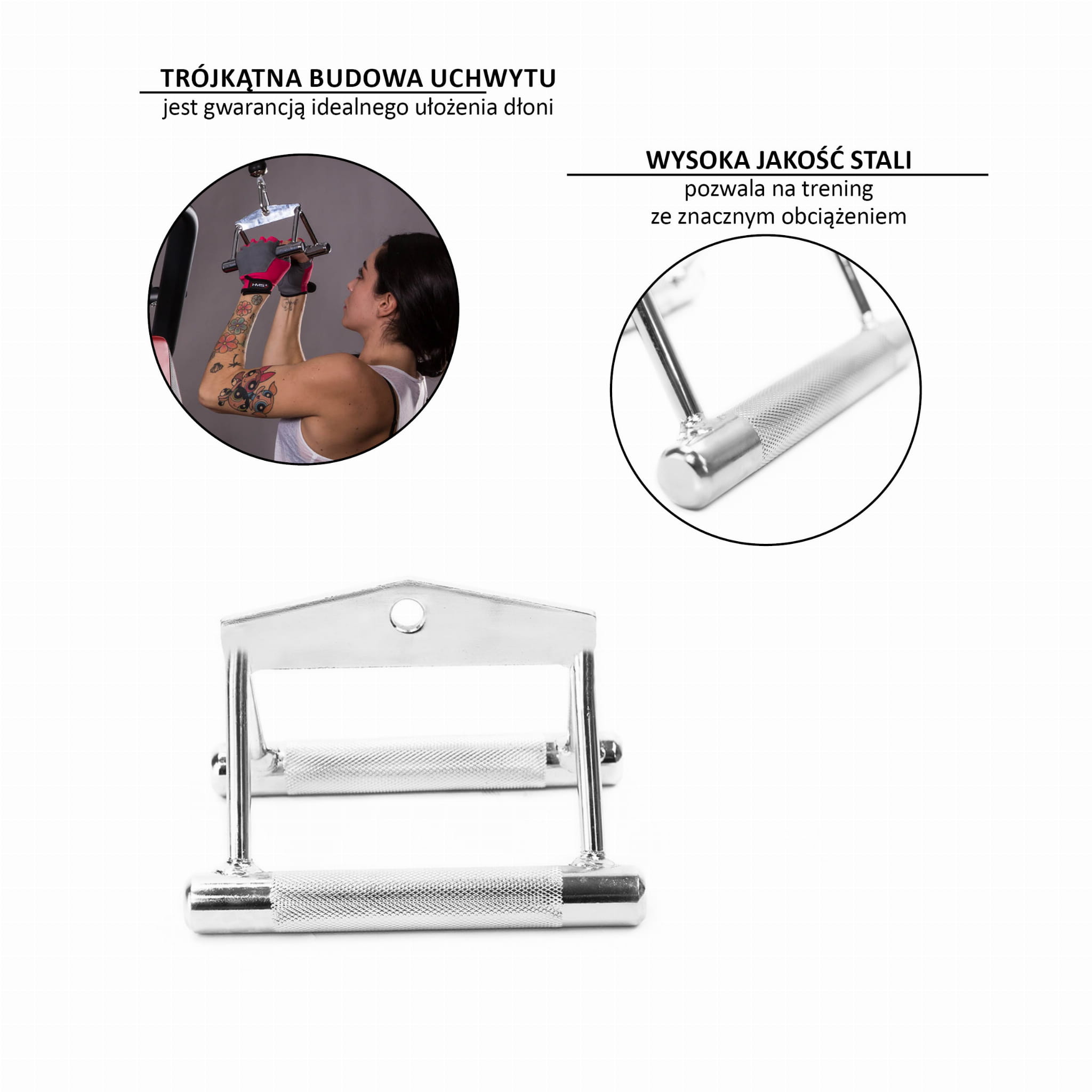 Trójkątna budowa uchwytu jest gwarancją idealnego ułożenia dłoni i wymuszenia przy tym prawidłowego ruchu w trakcie wykonywanego ćwiczenia. Stalowa, chropowata rękojeść zapewnia pewny chwyt oraz zapobiega wyślizgnięciu się przyboru z ręki, jednocześnie wymagając od nas mocniejszego chwytu. Dzięki temu pracujemy również nad rozbudową mięśni przedramienia. Niezbyt szeroki rozstaw rękojeści ułatwia utrzymanie prawidłowego toru ruchu, czyli prowadzenie łokci blisko tułowia. Wykonanie z wysokiej jakości stali pozwala na trening ze znacznym obciążeniem.