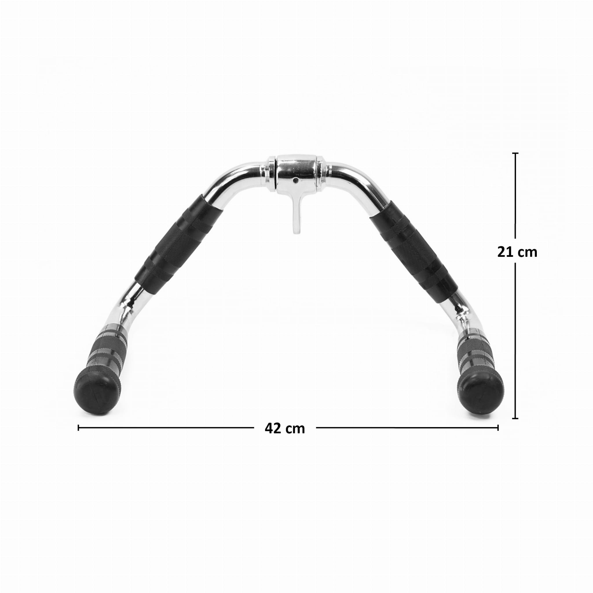 Kształt uchwytu pozwala na bardziej obszerny zakres ruchu niż w przypadku prostego czy też wąskiego uchwytu. Umożliwia on mocniejsze napięcie mięśnia, co skutkuje bardziej efektywnym treningiem. Jego budowa gwarantuje idealne ułożenie dłoni oraz wymusza prawidłowy ruch. Szeroki rozstaw rękojeści pozwala na wykonywanie ćwiczenia pod innym kątem niż przy wąskim uchwycie. Daje to możliwość efektywnego treningu oraz pełnego rozwoju grupy mięśniowej. Wykonanie ze stali daje możliwość treningu ze znacznym obciążeniem.