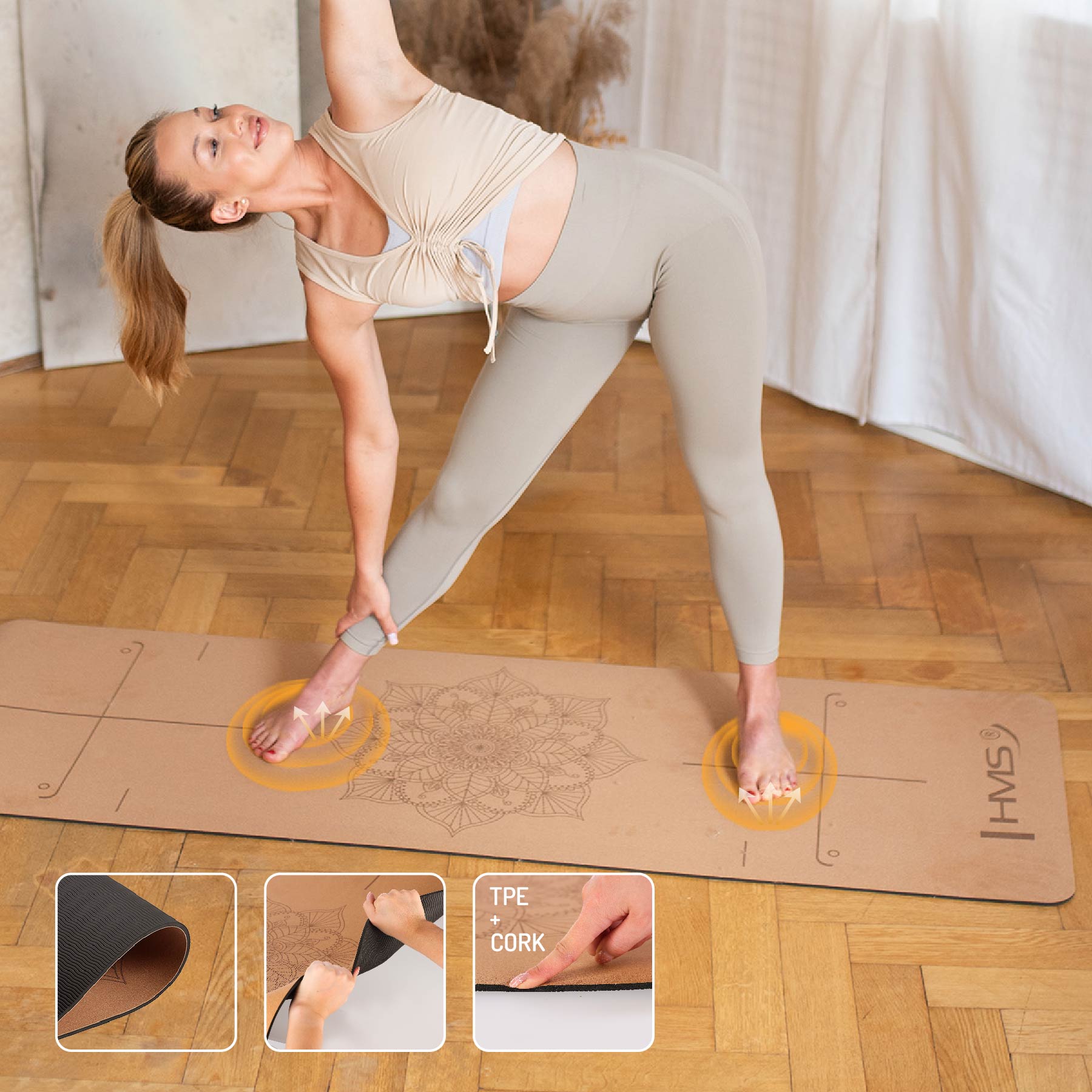 Zestaw do jogi od HMS Fitness to propozycja dla tych, którzy poszukują naturalnych, ekologicznych materiałów oraz wsparcia podczas swojej praktyki jogi. Składający się z maty wykonanej z połączenia korka i TPE, korkowej kostki oraz uniwersalnego paska, zestaw zapewnia pełen komfort i stabilność, które są niezbędne na każdym poziomie zaawansowania jogi.