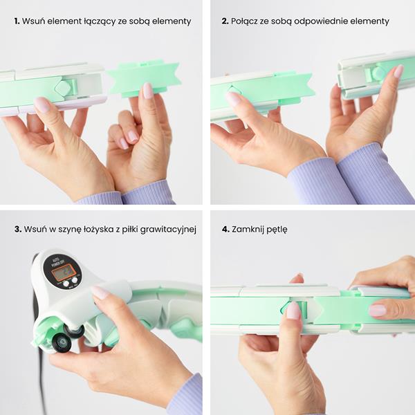 Montaż odbywa się za pomocą klipsów. Wystarczy wcisnąć klips, aby wyciągnąć lub wsunąć dodatkowy element. Potem należy wsunąć do pętli szynę z piłką grawitacyjną, dostosować długość paska i gotowe. Ważne, aby nie wyciągać elementu, w którym znajduje się sensor odpowiedzialny za dostarczanie danych. Dodatkowo dzięki kompaktowym rozmiarom jest łatwy w przenoszeniu, możesz zabrać ten produkt wszędzie ze sobą.