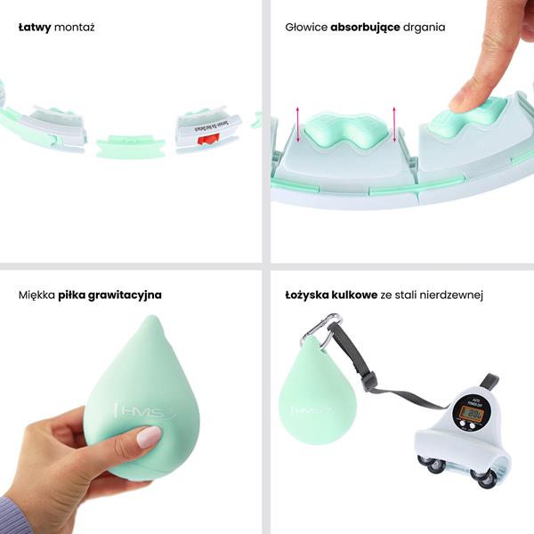 HHW06 HMS to regulowany hula-hop z absorbującymi drgania wypustkami i piłką grawitacyjną do fitnessu. Pozwala na jednoczesny trening i masaż talii 360 stopni. Jest perfekcyjny m.in. do wzmocnienia i ujędrnienia gorsetu mięśniowego. Dzięki regulacji obwodu HHW06 nigdy nie spadnie podczas ćwiczeń, dlatego domowy trening cardio może być długi i przyjemny, co jest gwarancją jeszcze lepszych efektów! W zestawie z pasem wyszczuplającym BR163 możesz osiągnąć swoją wymarzoną figurę jeszcze szybciej.