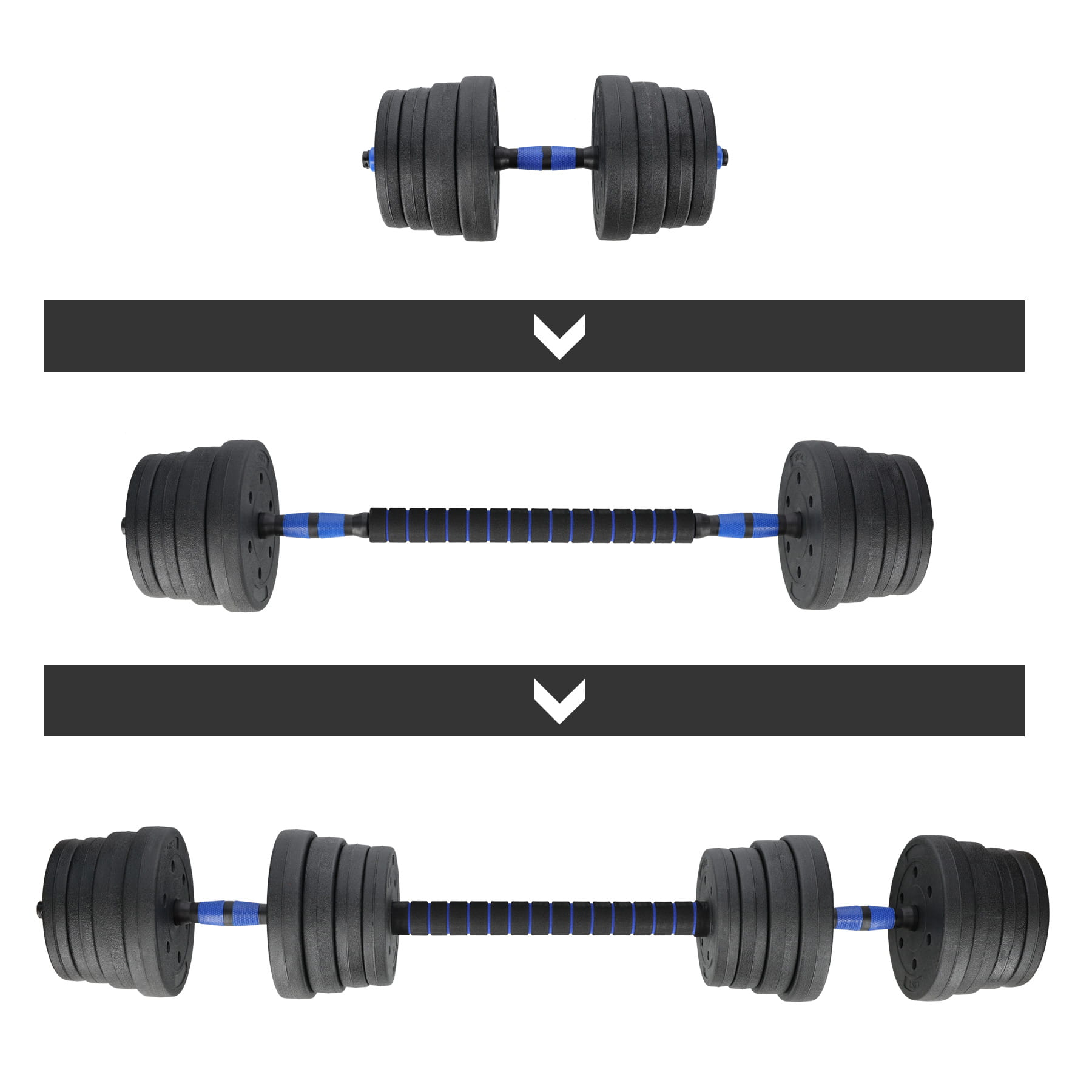 Co wyróżnia ten zestaw na tle konkurencji? W kilka chwil zamienisz swoje hantle w sztangę i w ten sposób będziesz mógł zmodyfikować lub rozbudować dany zestaw ćwiczeń.